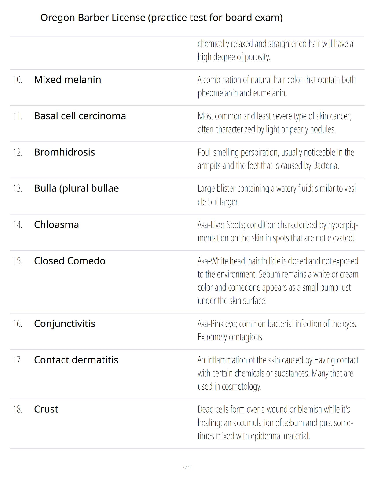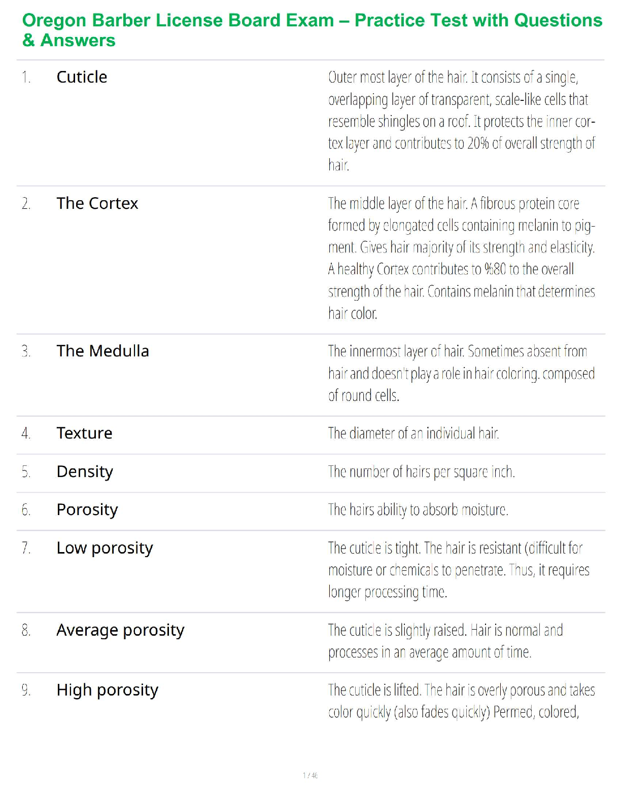 Ace your Oregon Barber License Board Exam with our meticulously compiled test bank. This essential study guide provides a complete set of practice questions and detailed, verified answers, covering critical topics you'll face on the test. From the fundamental structure of hair—including the cuticle, cortex, and medulla—to key concepts like texture, density, and porosity, this resource ensures you have the knowledge to succeed. Prepare effectively, build your confidence, and pass your licensing exam on the very first try. Get started on your path to becoming a licensed barber in Oregon today!