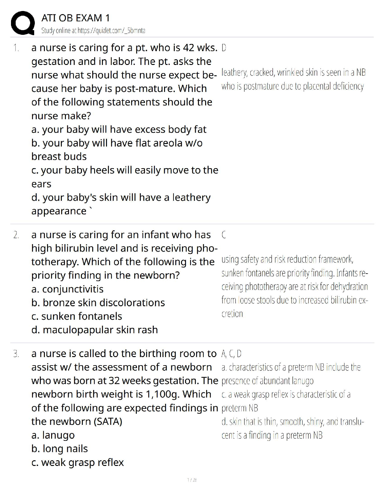 Ace your obstetrics exams with this complete test bank for the ATI RN Maternal Newborn Nursing, 11th Edition. This essential study guide provides a vast collection of practice questions and verified answers for ATI OB Exam 1, covering critical topics like post-term infant care, hyperbilirubinemia management, and preterm newborn assessment. Each question is designed to build your clinical judgment and ensure you master the material. Download now to prepare effectively, boost your confidence, and pass your ATI proctored exam with flying colors.