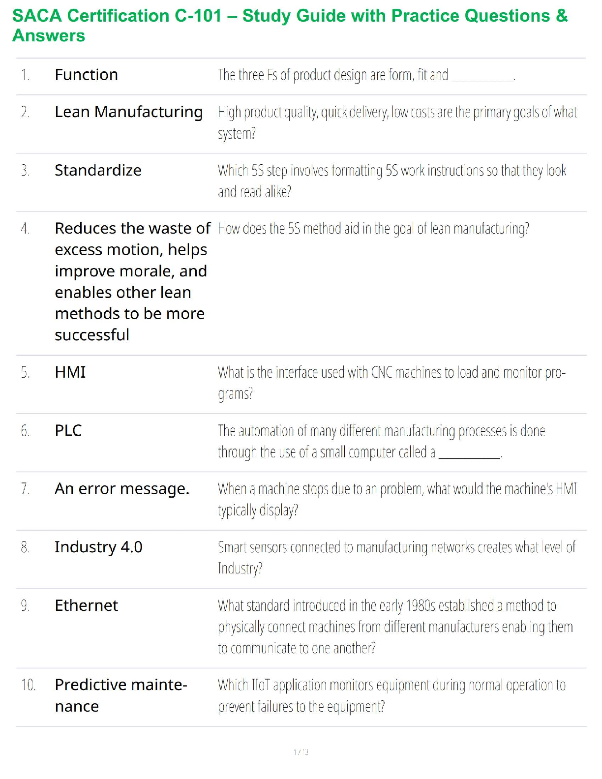Unlock success in your SACA C-101 certification with our comprehensive study guide and test bank, fully updated for the 2025/2026 academic year. This essential resource provides a complete collection of practice questions and verified answers, meticulously designed to cover all key exam topics including Lean Manufacturing, Industry 4.0 principles, PLCs, HMIs, and the 5S methodology. Our guide is your ultimate tool to master the concepts, build confidence, and pass the Certified Industry 4.0 Associate exam on your very first try. Stop worrying about resits and start preparing for success today!
