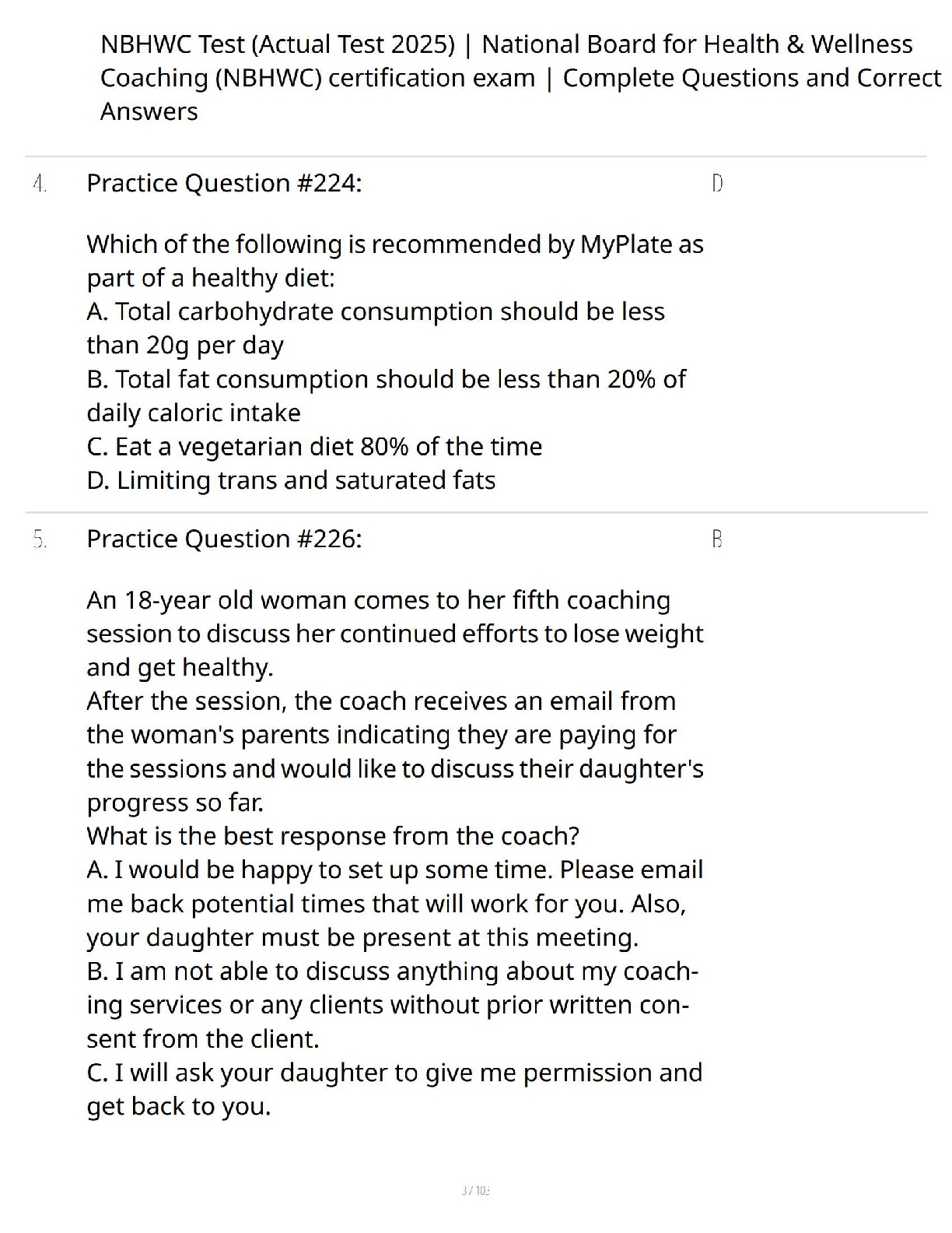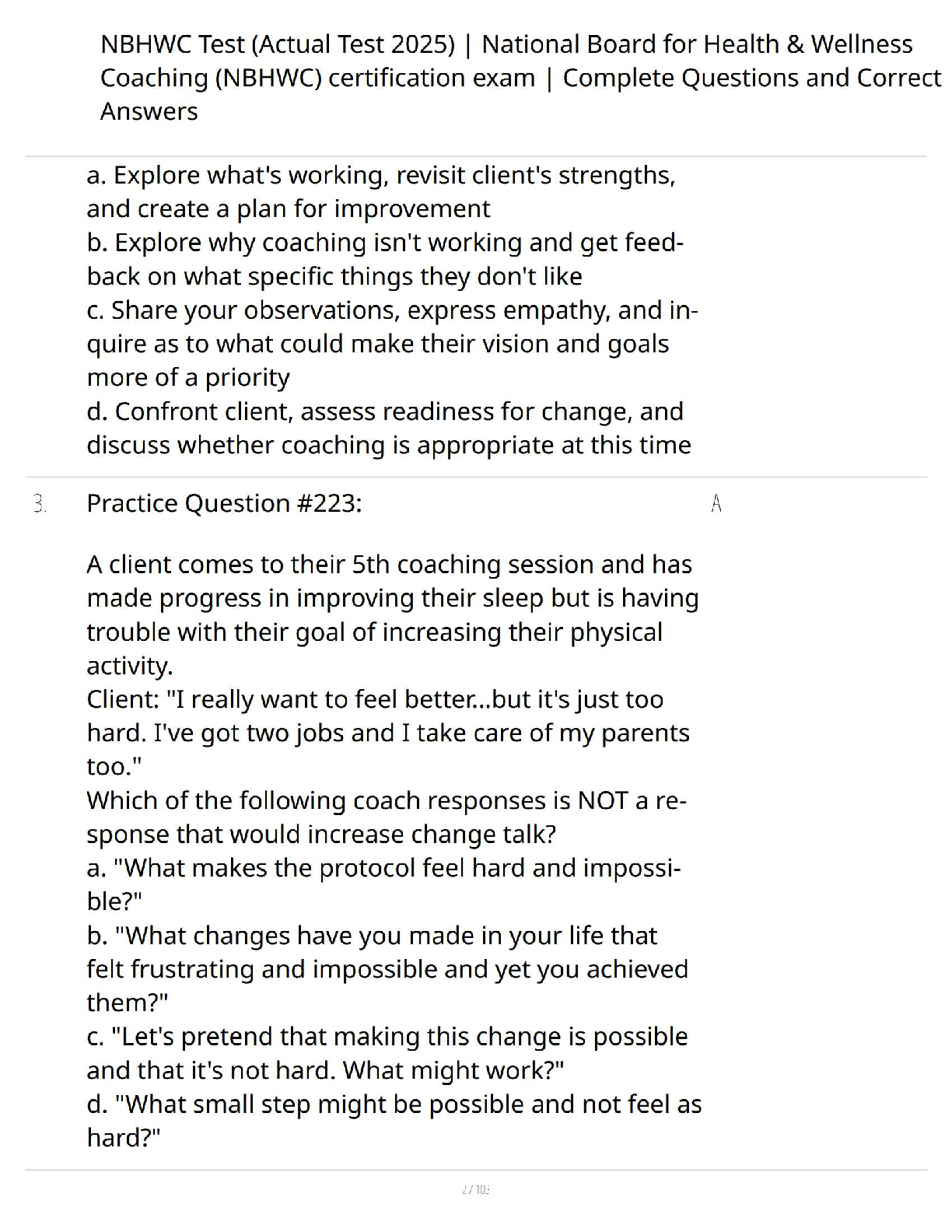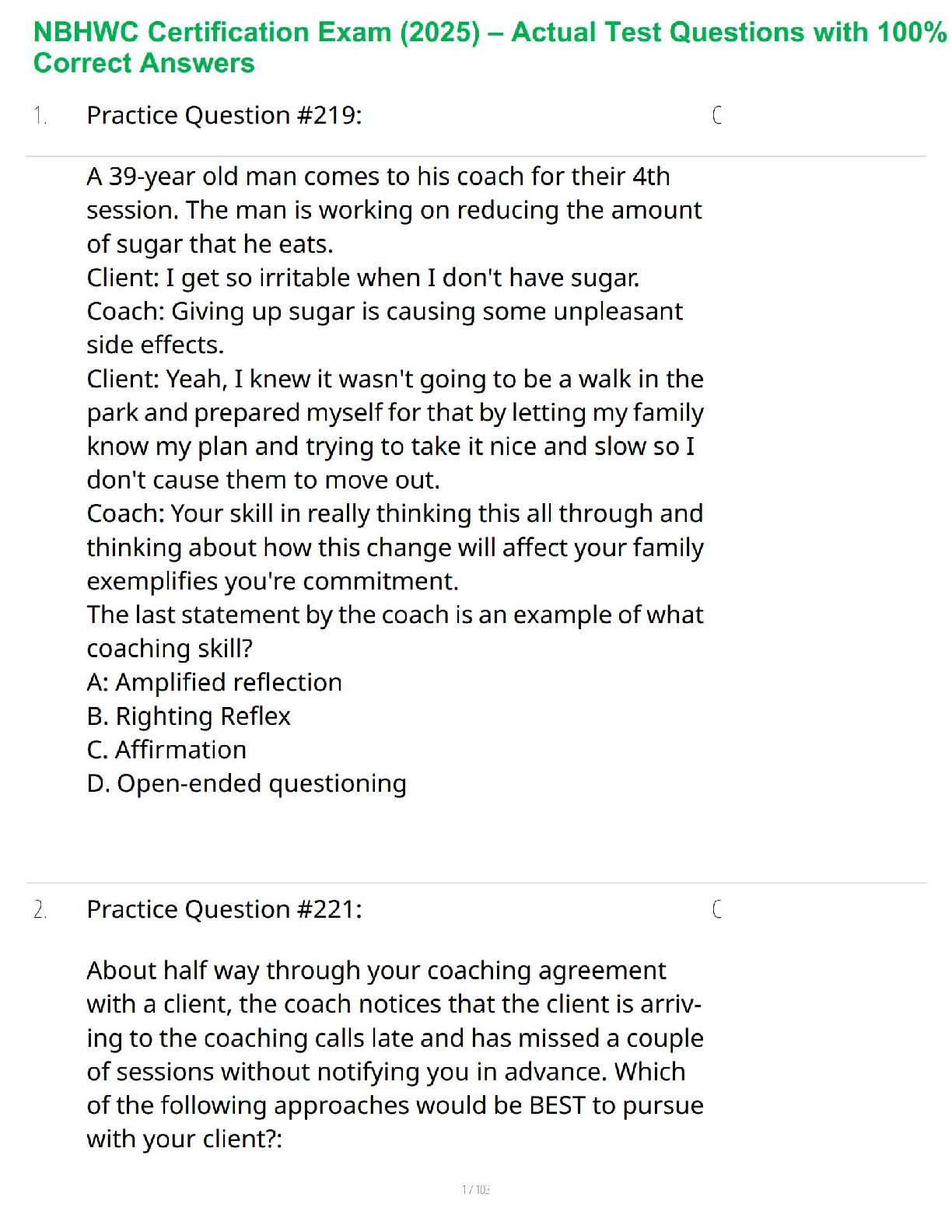 Ace your NBHWC certification with our premier 2025/2026 test bank! This comprehensive study guide is packed with actual exam questions and 100% verified answers, covering all the essential coaching skills and scenarios you'll face. From understanding client motivations to applying core coaching techniques like affirmation and reflection, our practice questions are designed to mirror the real exam. Prepare effectively, build your confidence, and achieve your health and wellness coaching certification on your very first attempt. Stop worrying about resits and start your successful coaching career today!