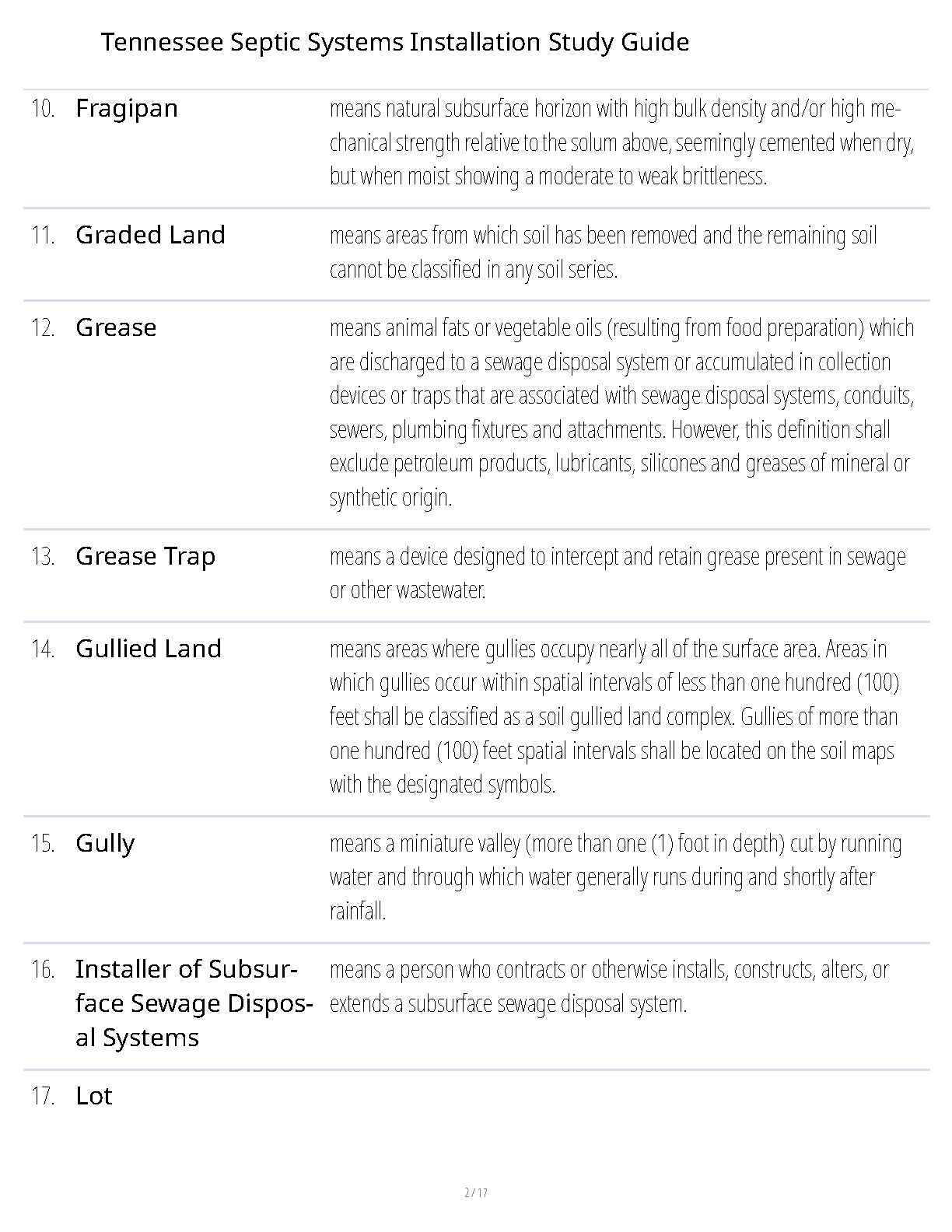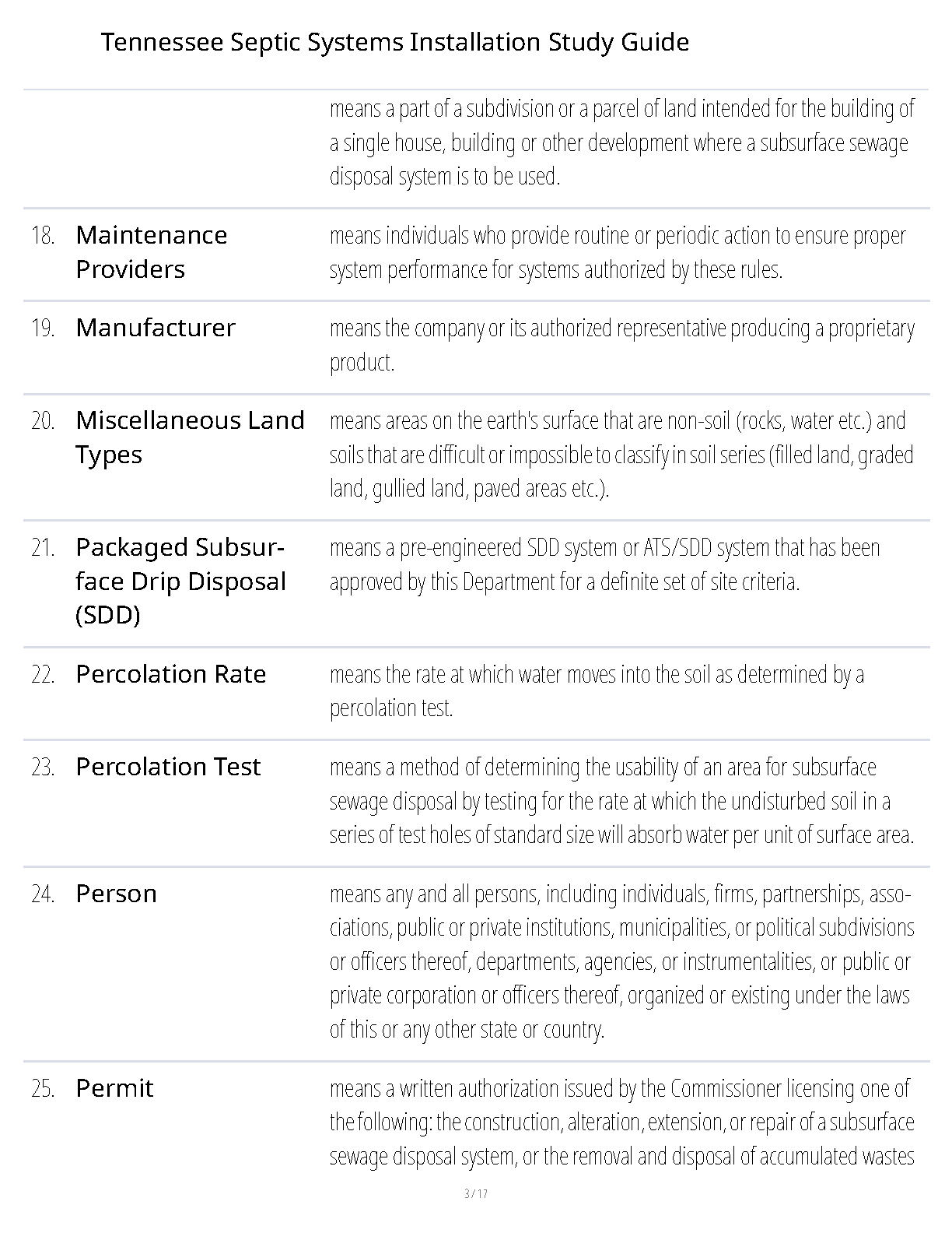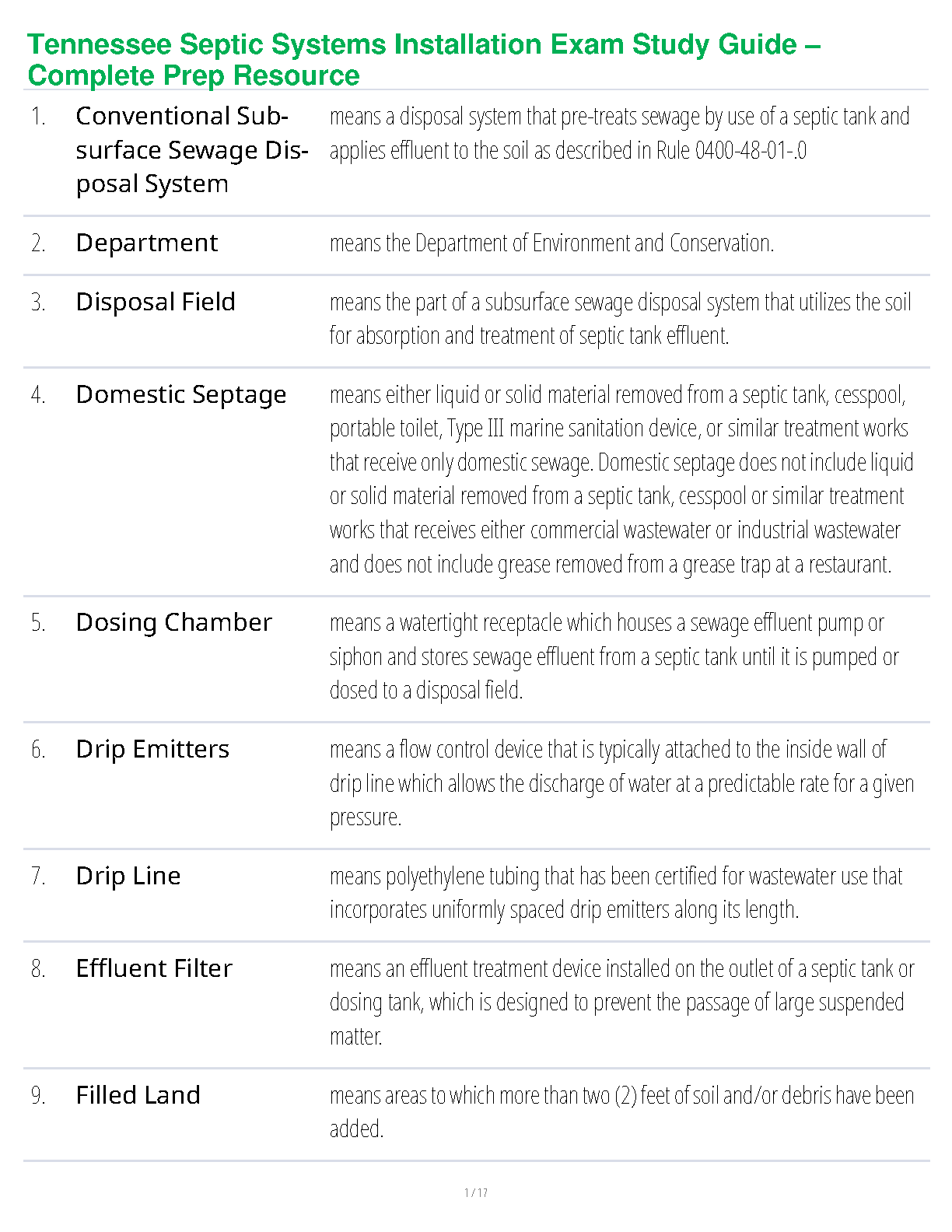 Get ready to ace your Tennessee Septic Systems Installation Exam with our comprehensive study guide, fully updated for the 2025/2026 academic year. This all-in-one resource covers every essential topic and definition you need to know, from Conventional Sub-surface Sewage Disposal Systems to Effluent Filters and Drip Lines. Our expertly crafted guide is designed to simplify complex concepts, making it easier than ever to master the material. Stop worrying about resits and gain the confidence to pass your certification exam on the very first attempt. Download now and take the first step towards your professional certification!