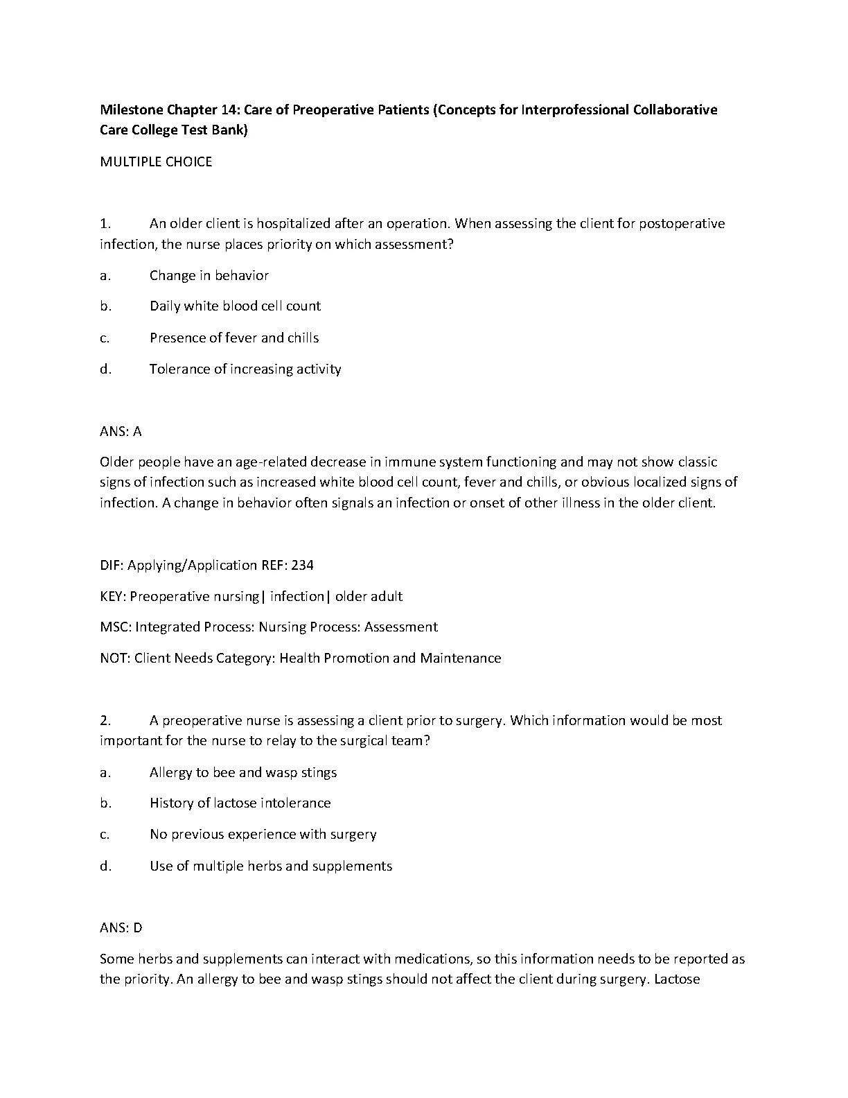 Milestone Chapter 14: Care of Preoperative Patients (Concepts for Interprofessional Collaborative Care College Test Bank). DOWNLOAD on www.hackedexams.com INSTANTLY.