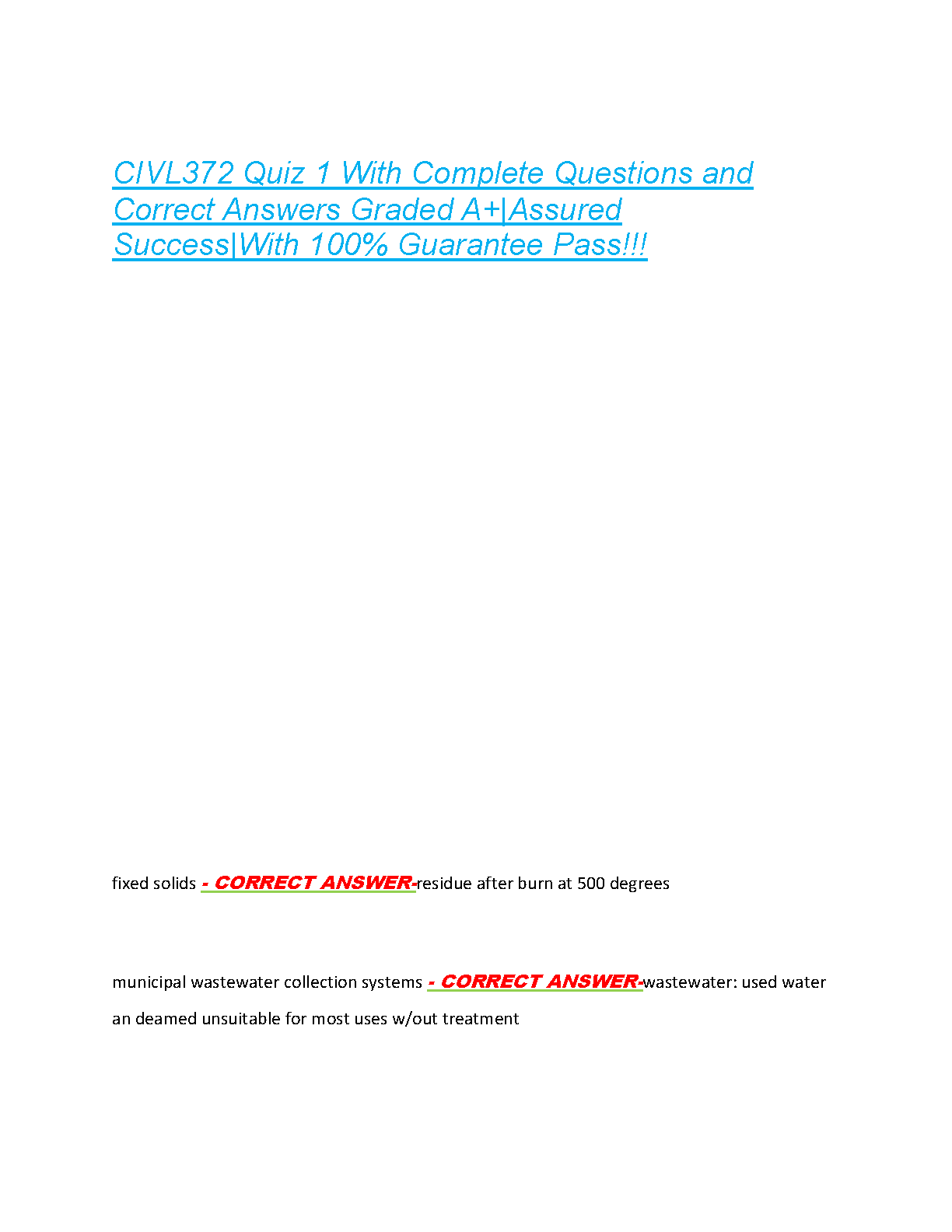 CIVL372 Water and Wastewater Engineering Quiz 1 Test Bank | Verified Questions & Correct Answers for Guaranteed Success