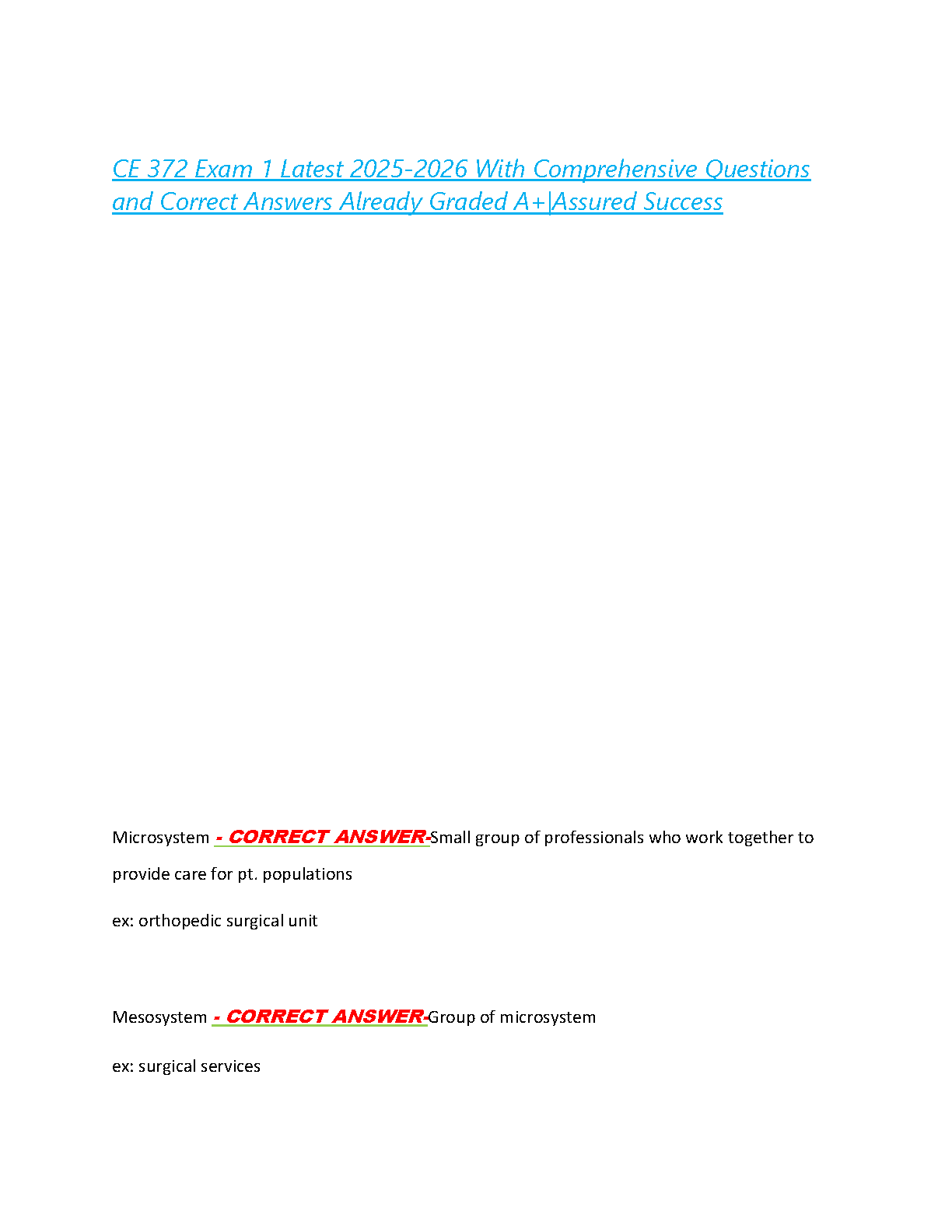 Prepare for success in your CE 372 course with our latest Exam 1 Test Bank for the 2025-2026 academic year. This comprehensive resource is expertly designed to help you ace your first exam and avoid resits. It features a complete set of verified questions and detailed, correct answers covering key topics like healthcare microsystems and mesosystems. Our A+ graded materials give you the confidence you need to master the concepts and achieve top marks. Download now and guarantee your success on exam day!
