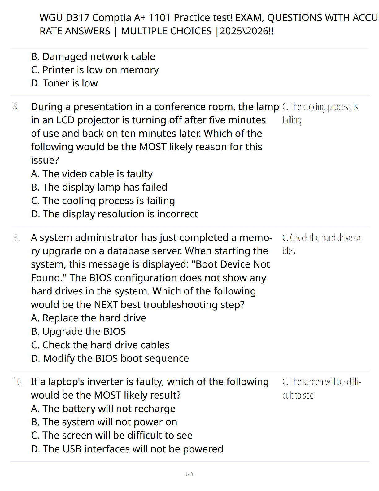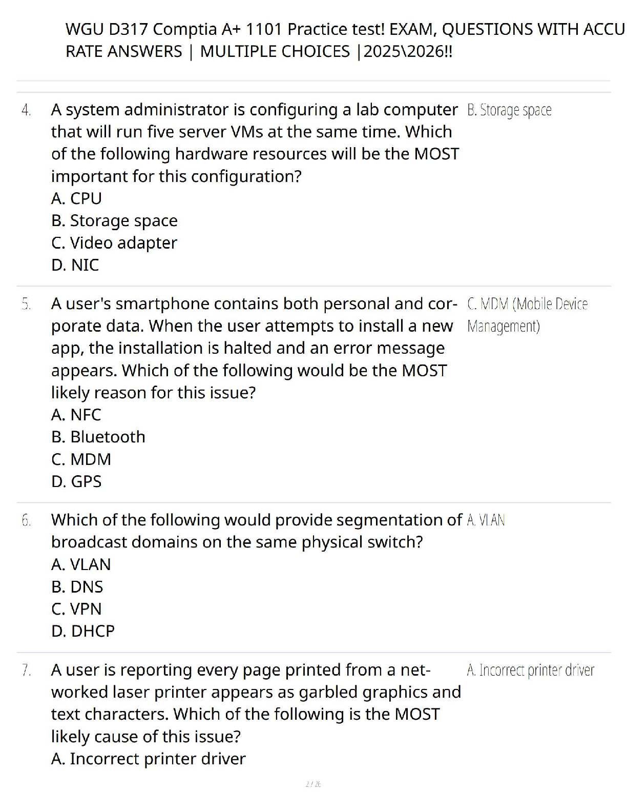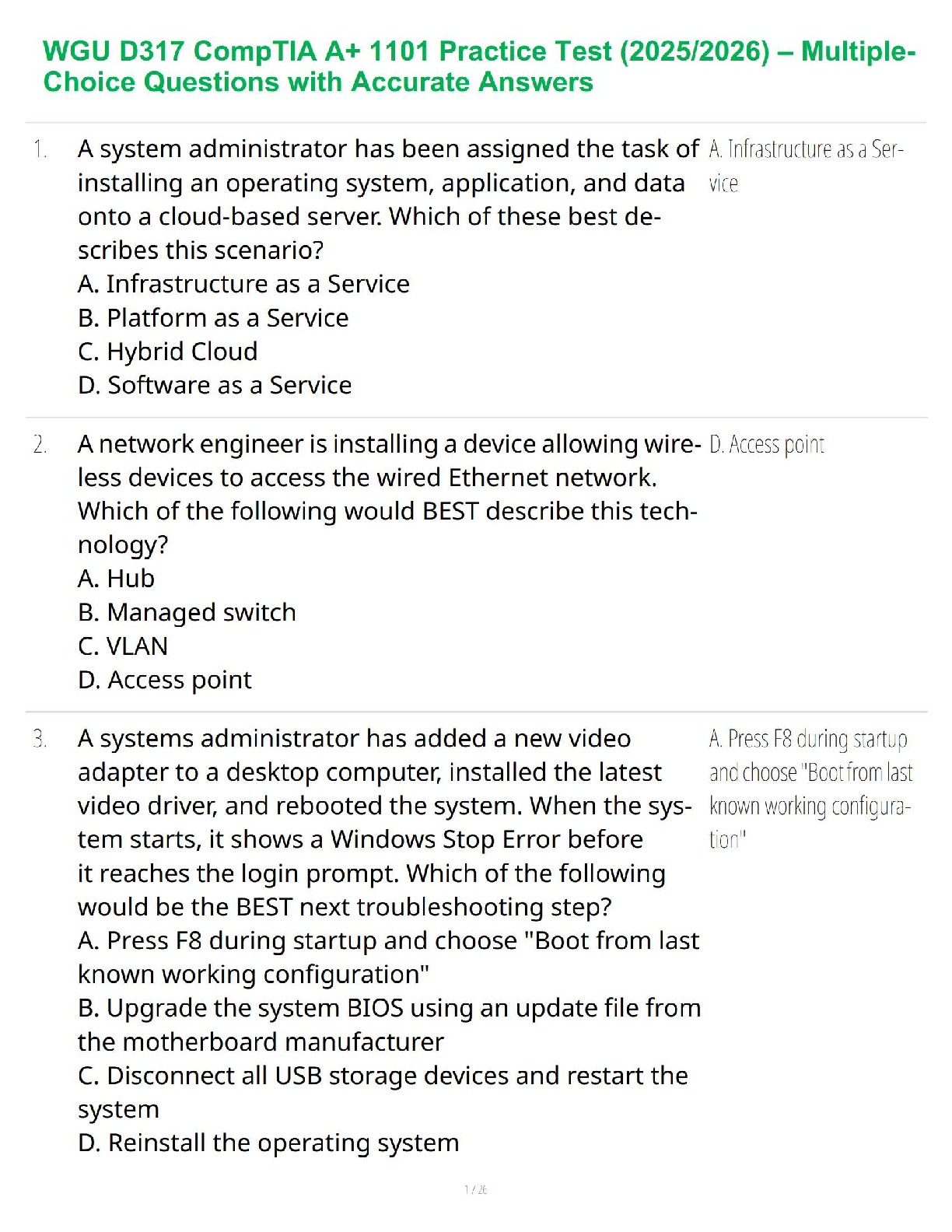 Ace your WGU D317 course and conquer the CompTIA A+ 1101 certification exam with this newly updated test bank for the 2025/2026 academic year. This essential study resource provides a comprehensive collection of practice questions, complete with accurate and verified answers, mirroring the format and difficulty of the real exam. Master critical topics including cloud infrastructure (IaaS, PaaS, SaaS), networking fundamentals, and PC troubleshooting. This test bank is expertly designed to help you build confidence, eliminate exam anxiety, and achieve a passing score on your very first attempt, saving you from the stress of resits.
