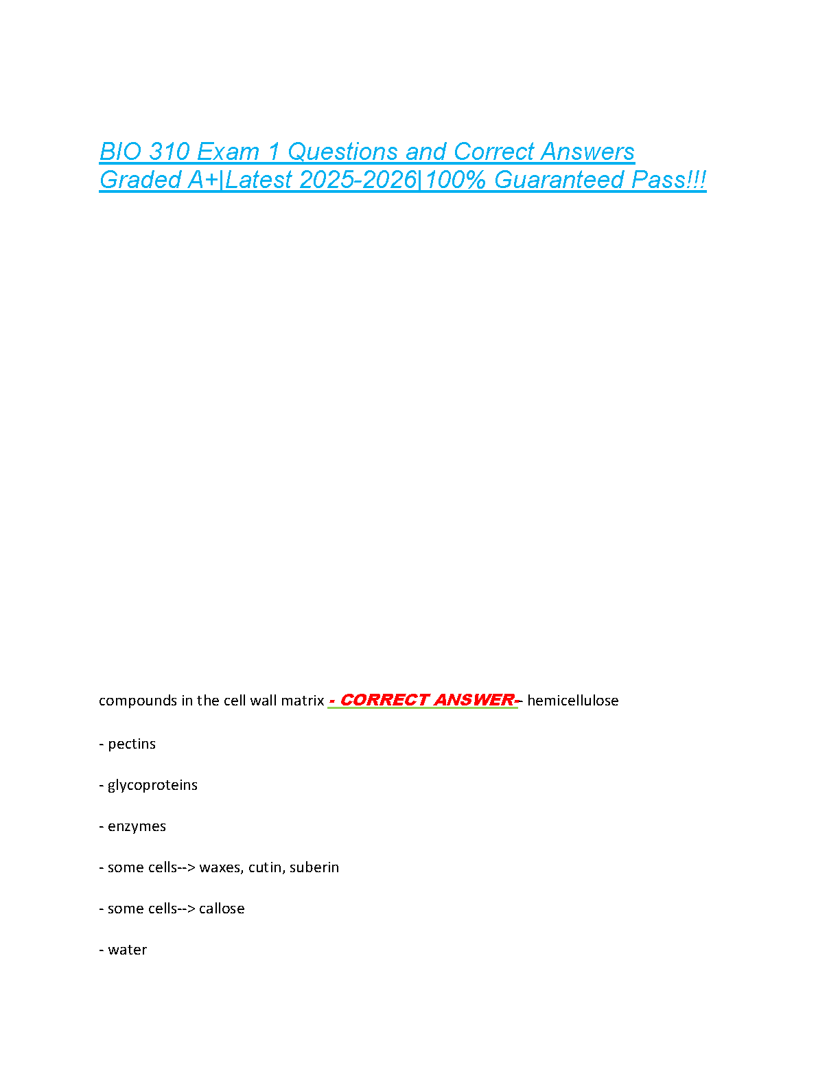 Unlock academic success in your BIO 310 course with our comprehensive test bank for Exam 1. This resource, updated for the 2025-2026 academic year, is meticulously designed to help you achieve an A+ grade and guarantee a pass on your first try. It features a wide range of exam-style questions paired with 100% correct and verified answers, covering all essential topics. Stop struggling and start studying smarter. Master the key concepts and walk into your exam with confidence. Download now to secure your top grade!