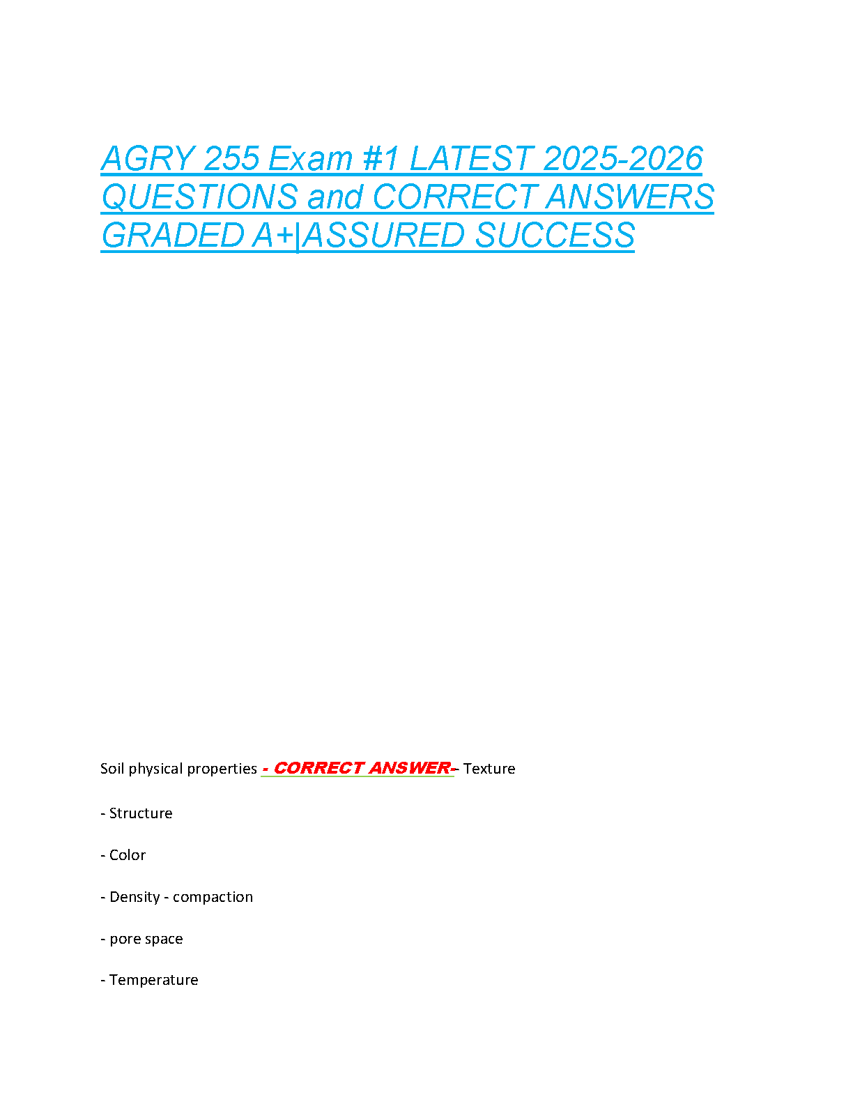 Prepare to excel in your AGRY 255 Soil Science course with our premier test bank for Exam 1, fully updated for the 2025-2026 academic year. This essential study tool provides an extensive collection of questions paired with expertly verified answers, covering fundamental topics such as soil physical properties, texture, structure, and density. Aligned with key concepts from the definitive textbook 'Elements of the Nature and Properties of Soils' by Nyle C. Brady and Ray R. Weil, this guide is your key to not just passing, but achieving an A+ grade. Download now for assured success and ace your exam on the first attempt.
