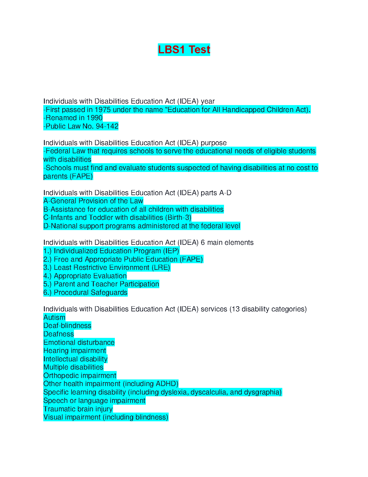 Unlock exam success with this comprehensive study guide for the LBS1 Test, fully updated for the 2025/2026 academic year. This guide distills the complex Individuals with Disabilities Education Act (IDEA) into an easy-to-understand summary. It covers all essential topics, including the purpose of IDEA, its four main parts (A-D), the 6 core elements like IEP and FAPE, and a complete list of the 13 recognized disability categories. Designed to help you study efficiently and retain key information, this resource is your ultimate tool to pass your special education exam on the first try and avoid costly resits.