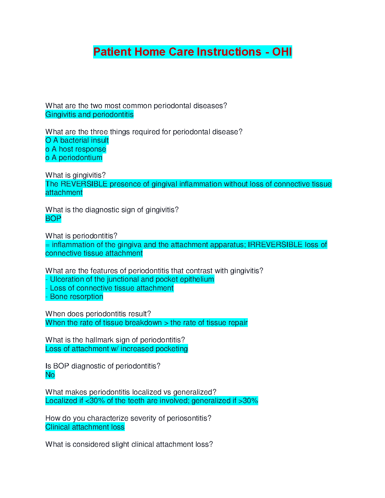 Unlock success in your dental hygiene or dentistry exams with our latest 2025/2026 study guide focused on Patient Oral Hygiene Instructions (OHI) for Periodontal Diseases. This comprehensive resource is expertly designed to help you pass on your first attempt and avoid costly resits. Dive deep into the essential topics with a clear and concise question-and-answer format, covering the critical differences between gingivitis and periodontitis, key diagnostic signs like Bleeding on Probing (BOP), and the irreversible effects of periodontitis such as loss of connective tissue and bone resorption. Master the fundamental concepts, from the causes of periodontal disease to its classification and severity. Get the edge you need to excel in your coursework and clinical exams with this essential study tool.