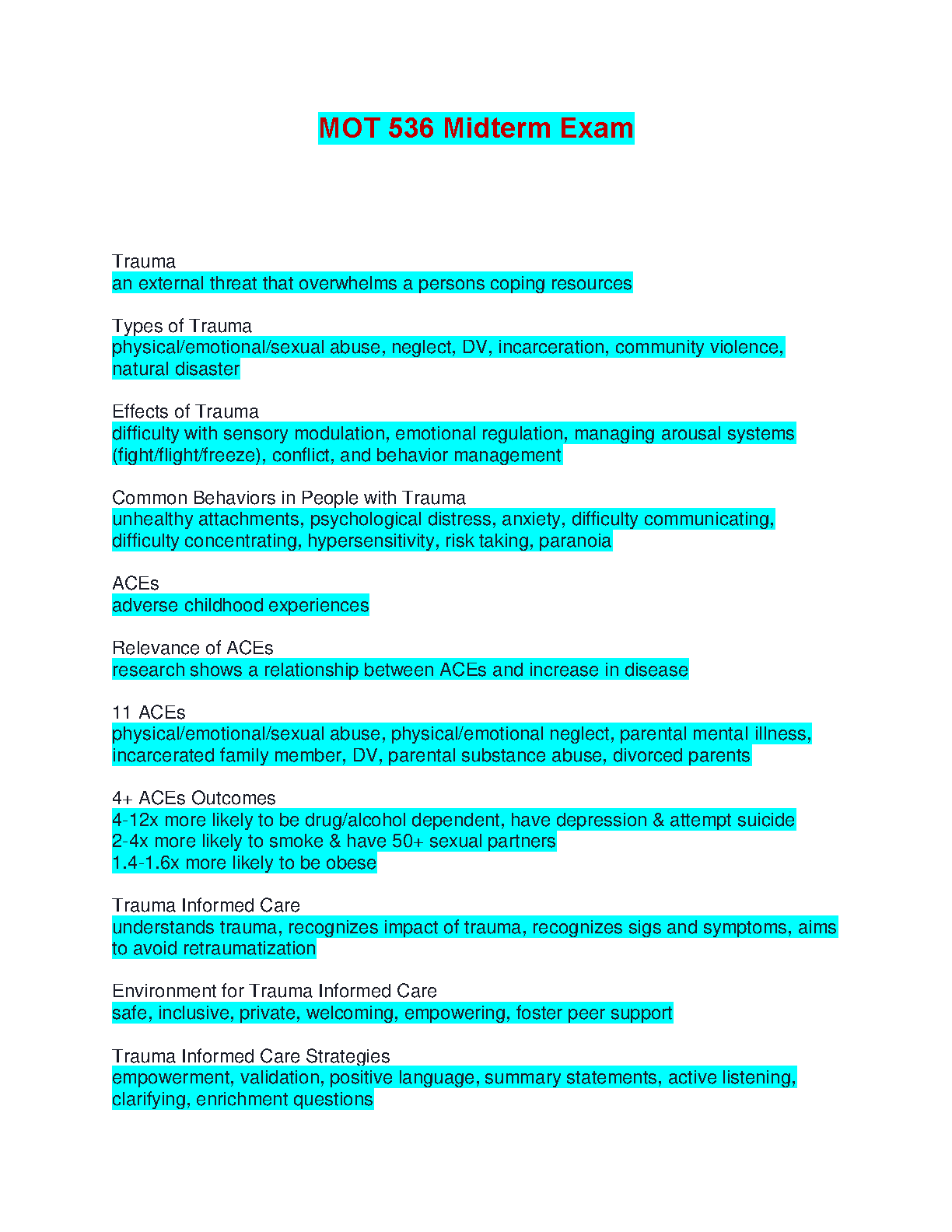 Ace your MOT 536 Midterm Exam with this expertly crafted study guide for the 2025/2026 academic year. This resource provides a complete breakdown of all essential topics, including the definition and types of trauma, its profound effects, and common behavioral responses. Delve into the critical subject of Adverse Childhood Experiences (ACEs), understanding the 11 types and their long-term outcomes. Master the principles of Trauma-Informed Care, from creating a safe environment to implementing effective strategies like empowerment and active listening. This concise, highlighted guide is designed to help you absorb key information quickly and pass your exam on the first attempt, avoiding costly resits.