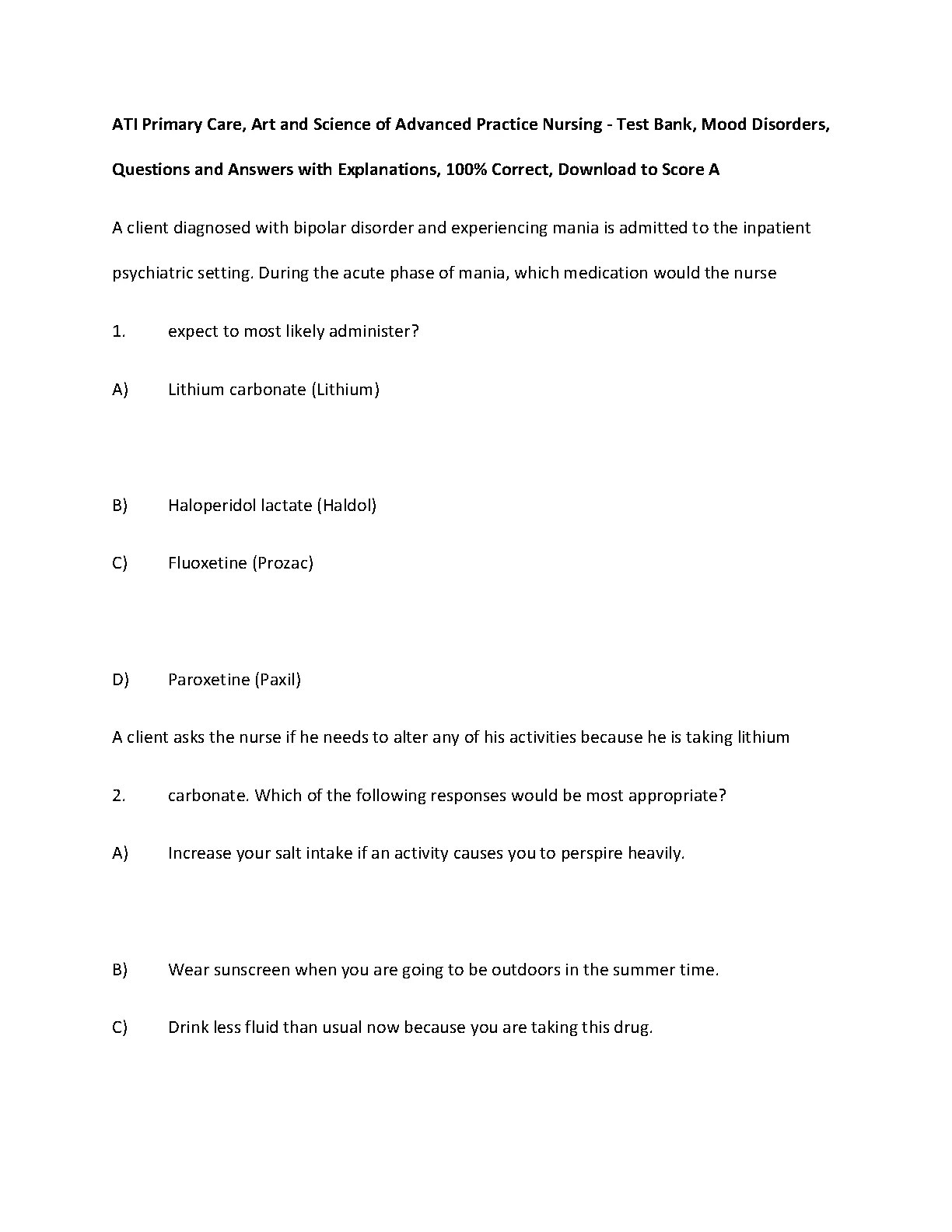 ATI Primary Care, Art and Science of Advanced Practice Nursing - Test Bank, Mood Disorders, Questions and Answers with Explanations, 100% Correct. DOWNLOAD on www.hackedexams.com INSTANTLY.
