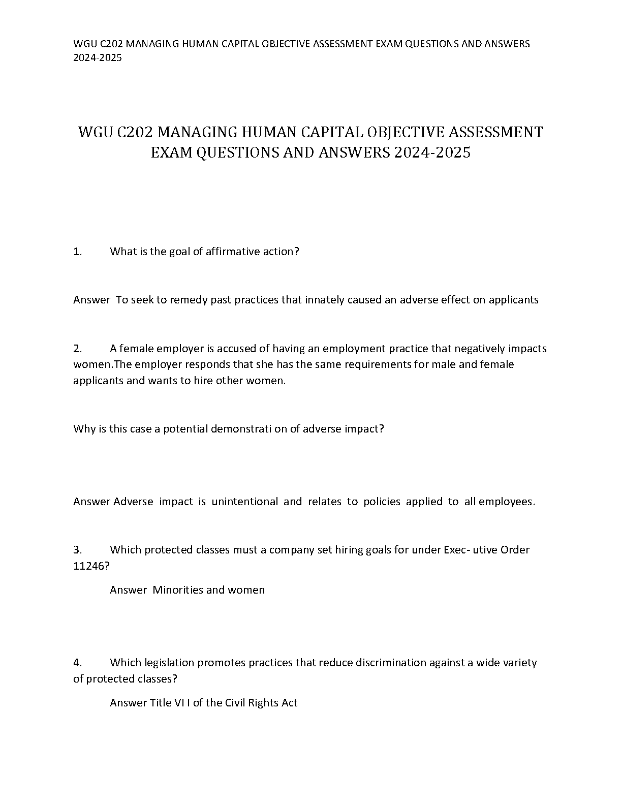 Get ready to ace your WGU C202 Managing Human Capital objective assessment with our comprehensive test bank, fully updated for the 2025-2026 academic year. This essential study guide features a complete collection of exam questions paired with 100% accurate and verified answers. Master crucial topics such as affirmative action, adverse impact, and employment legislation to build the confidence you need. Designed specifically to help you pass on your first attempt, this resource is your key to success in C202 and avoiding costly resits. Download now and start studying smarter!