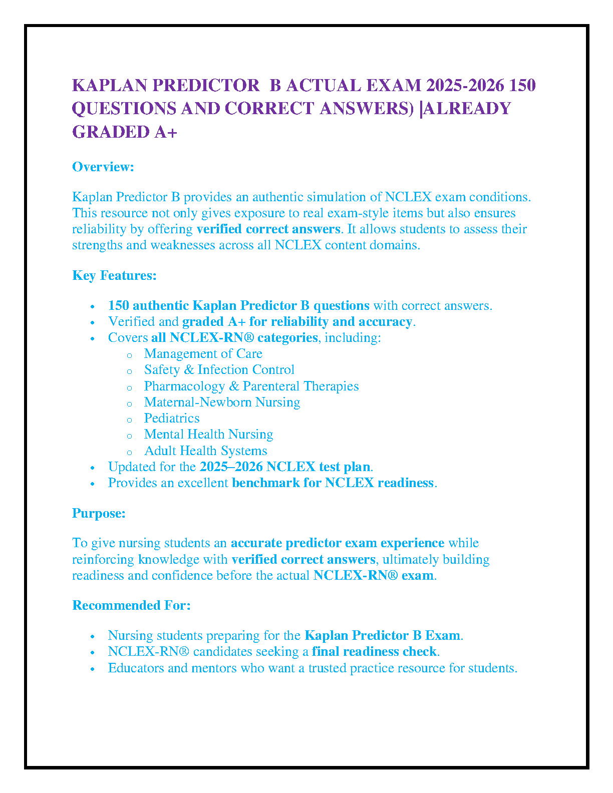 Master the NCLEX-RN with the Kaplan Predictor B Actual Exam for 2025-2026. This comprehensive test bank features 150 authentic practice questions, each with verified correct answers, ensuring you receive an A+ graded study experience. Designed to mirror the actual NCLEX test plan, this guide covers all critical nursing domains, including Management of Care, Safety & Infection Control, Pharmacology, and more. Use this essential resource to accurately predict your exam performance, identify areas for improvement, and build the confidence needed to pass your NCLEX on the first try.