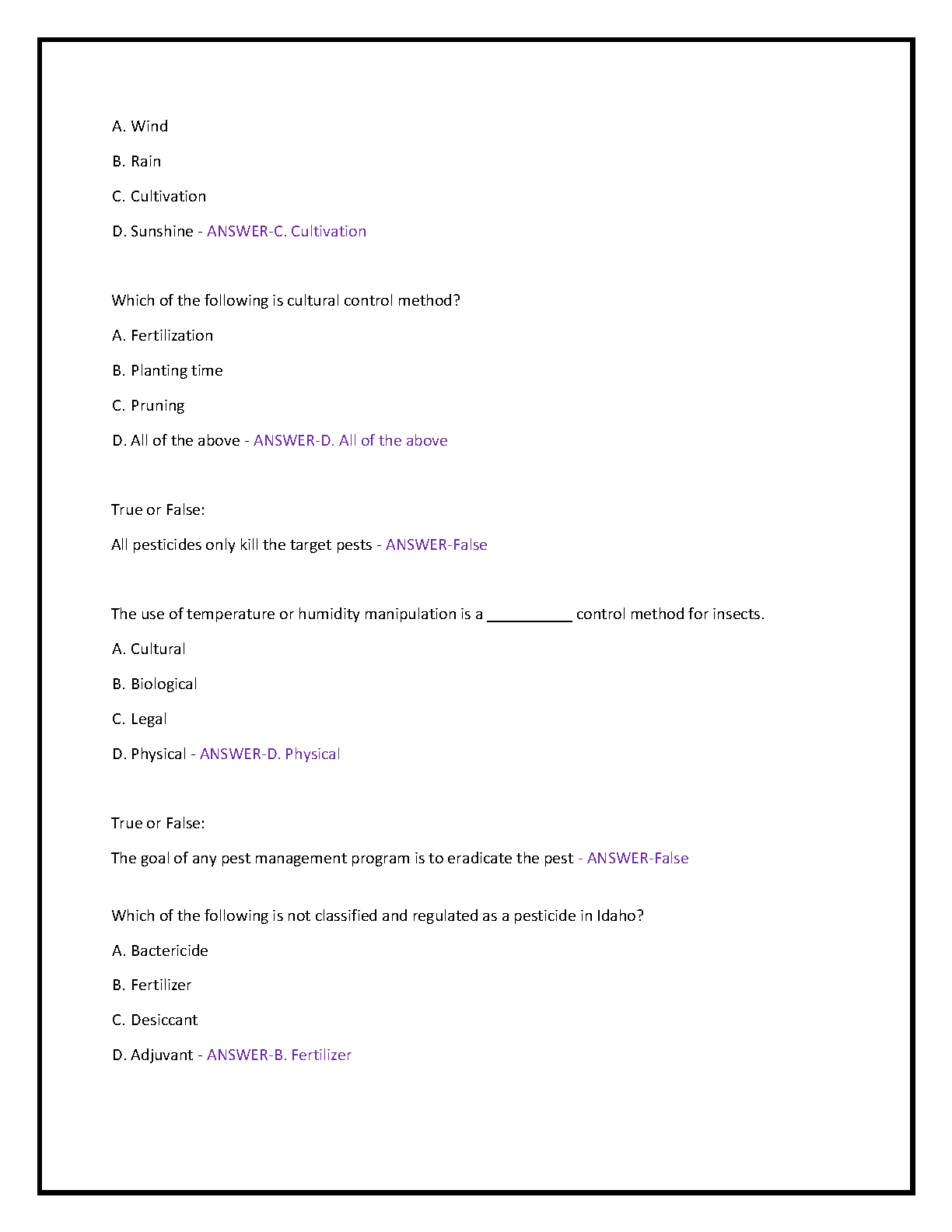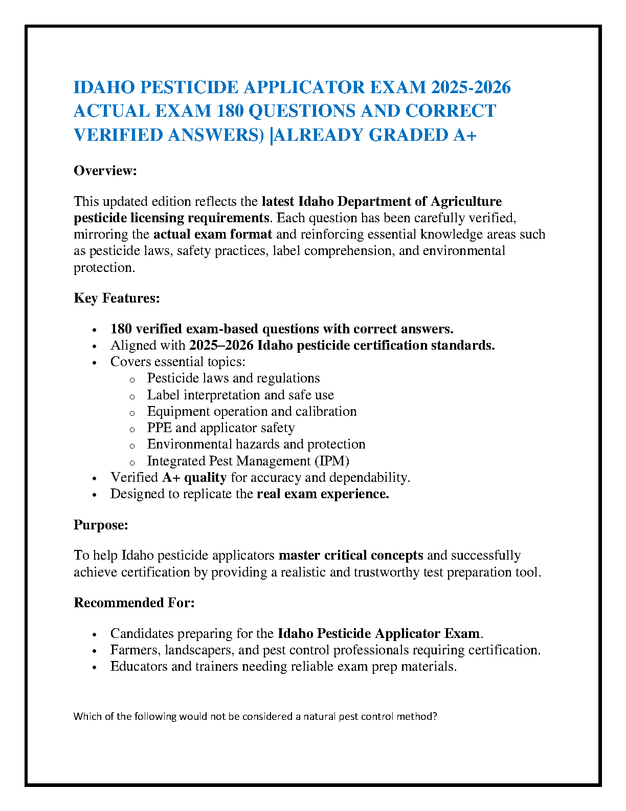 Ace your Idaho Pesticide Applicator certification on the first try with our comprehensive 2025-2026 Test Bank. This A+ graded resource is packed with 180 actual exam-style questions, complete with verified and correct answers. It's fully updated to align with the latest Idaho Department of Agriculture pesticide licensing standards for the 2025-2026 period. Master all essential topics, including pesticide laws and regulations, label interpretation, equipment calibration, PPE and applicator safety, environmental protection, and Integrated Pest Management (IPM). Designed to simulate the real exam experience, this study guide is the ultimate tool for candidates aiming for successful certification.
