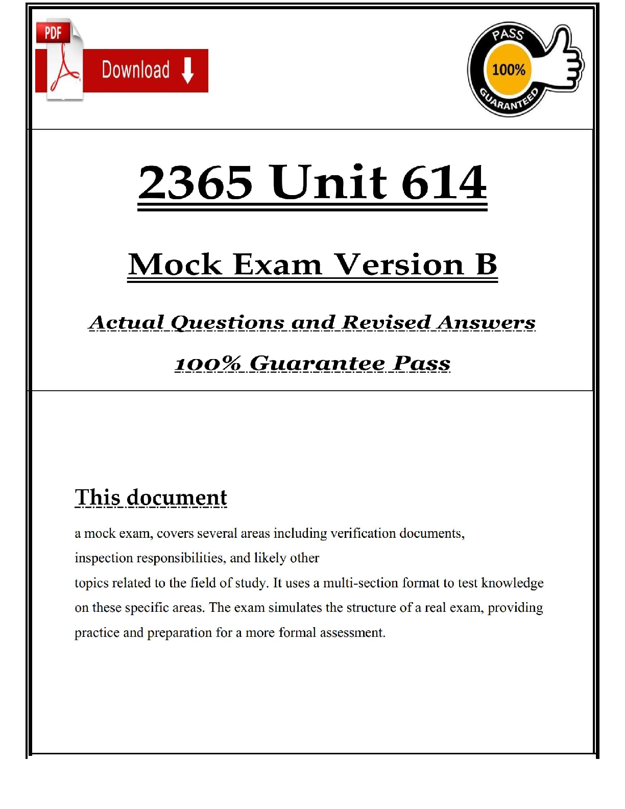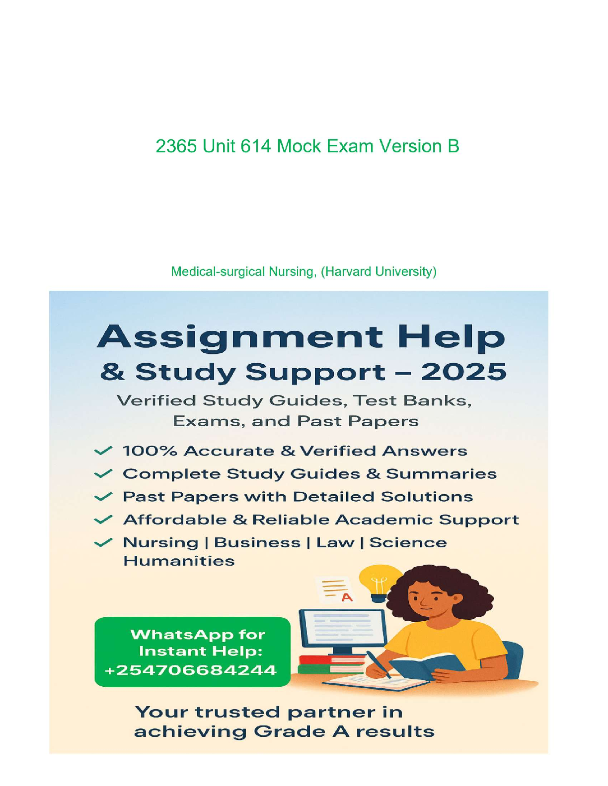 Excel in your Medical-Surgical Nursing course with our latest 2025/2026 Test Bank for 2365 Unit 614 Mock Exam (Version B). This comprehensive study resource provides a complete set of verified questions and detailed, accurate answers, designed to mirror the actual exam format. Master key concepts, practice with confidence, and gain the knowledge you need to achieve a Grade A. This study guide is your ultimate tool to pass your exams on the first try and avoid resits. Get instant access to this reliable academic support and ace your nursing course.