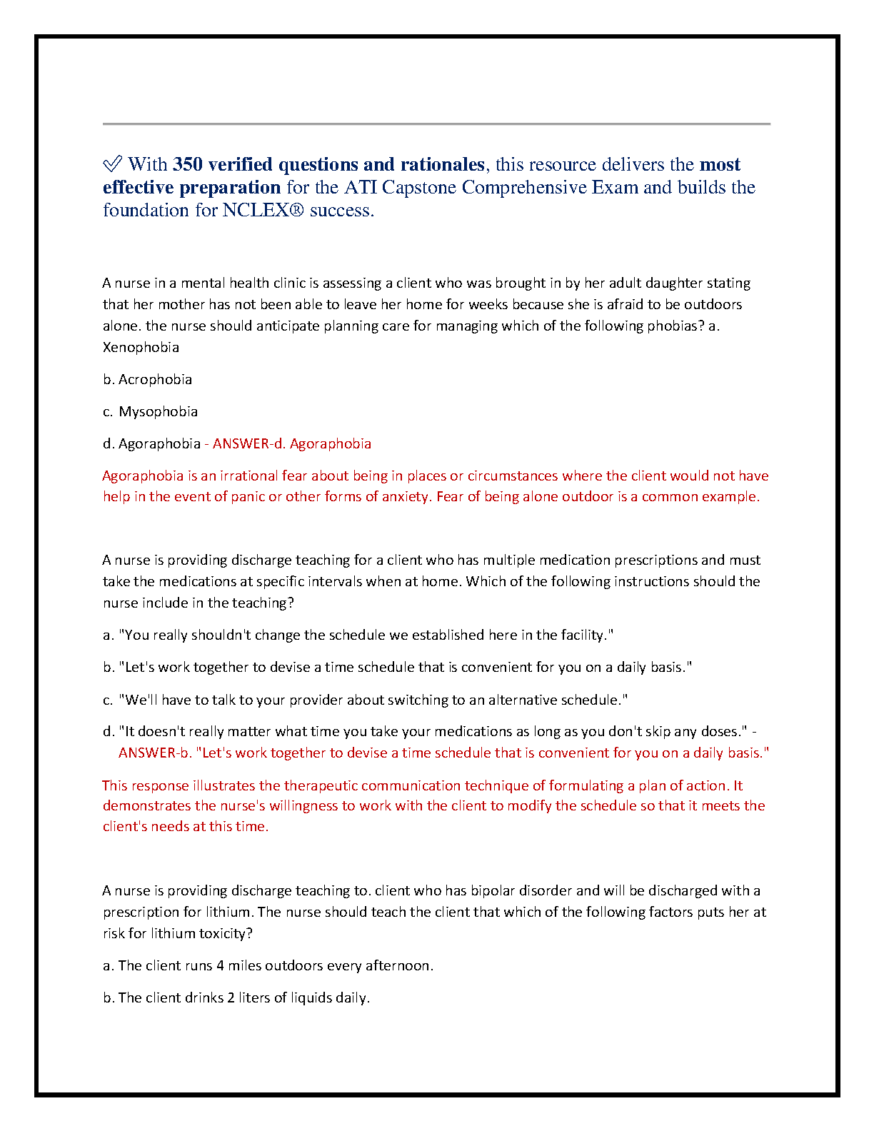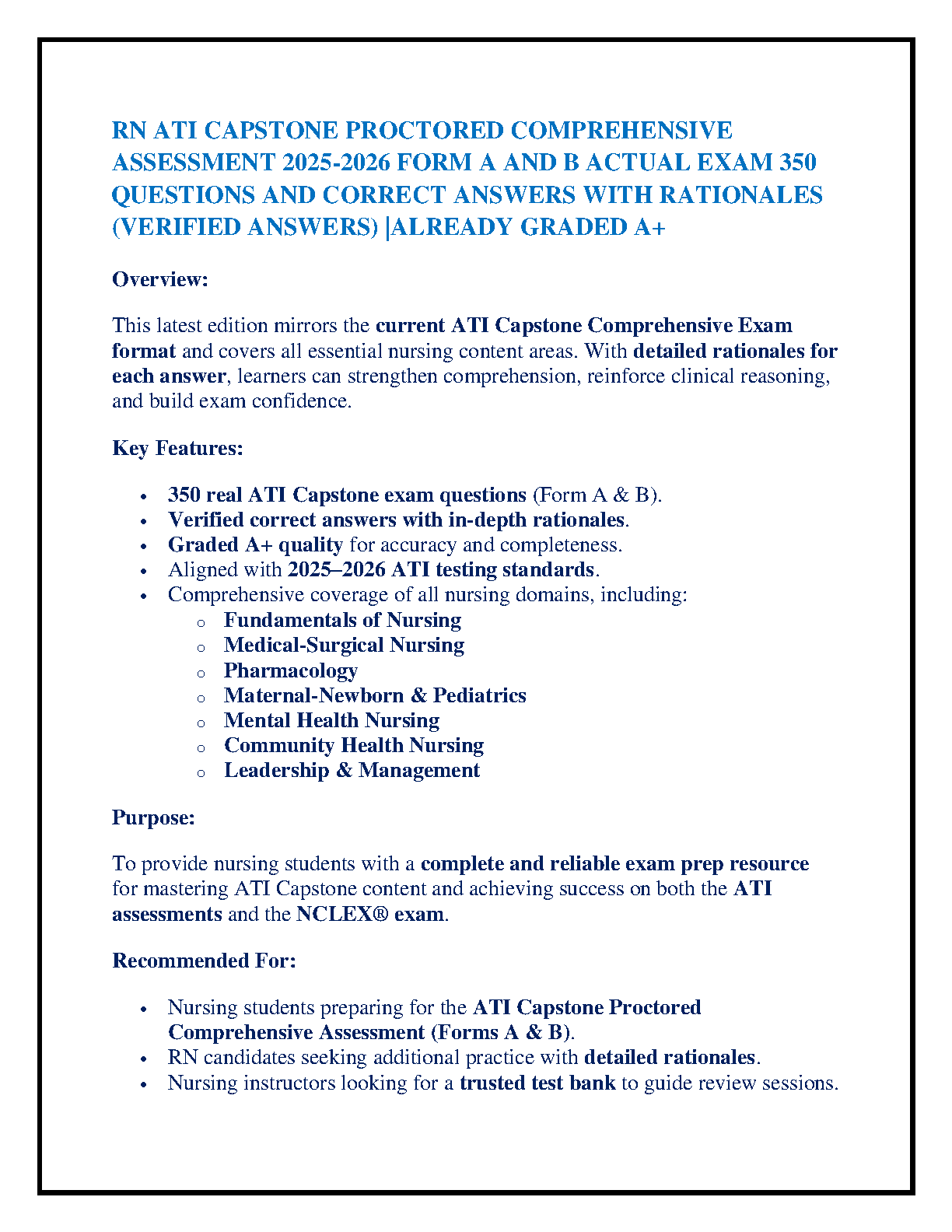 Ace your ATI RN Capstone Proctored Comprehensive Assessment on the first try with our latest 2025-2026 test bank! This ultimate study guide features 350 actual exam questions from Form A and B, complete with verified correct answers and detailed, easy-to-understand rationales for every question. Designed to mirror the current exam format, this A+ graded resource covers all essential nursing domains, including Fundamentals, Medical-Surgical, Pharmacology, and more. Boost your clinical reasoning, solidify your knowledge, and walk into your exam with confidence. This is the complete and reliable prep tool you need to master the ATI Capstone and excel on your path to the NCLEX®.