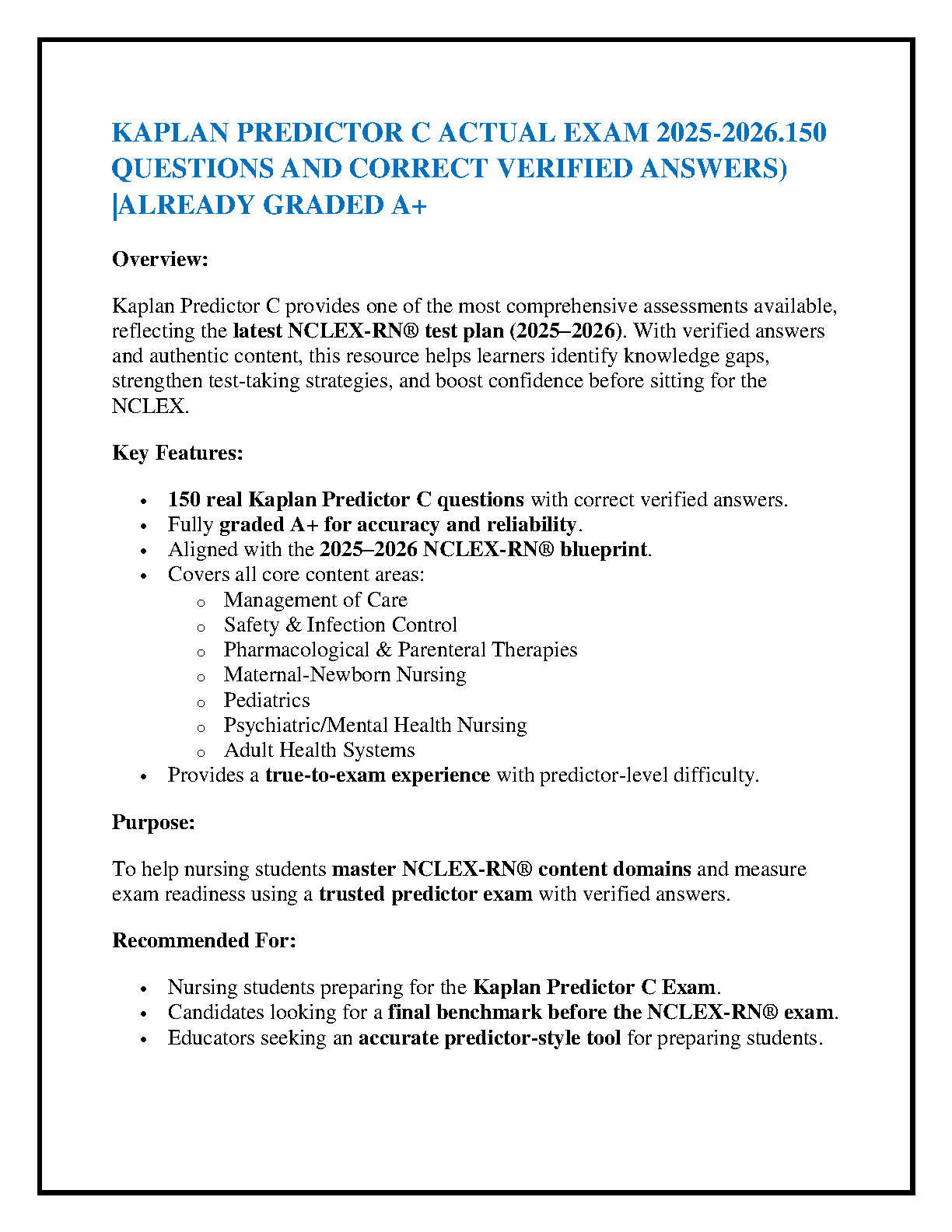 Unlock your potential and conquer the NCLEX-RN on your first attempt with our comprehensive Kaplan Predictor C Actual Exam Test Bank for the 2025-2026 academic year. This essential study guide features 150 meticulously selected questions, complete with correct, verified answers that have already earned an A+ grade for accuracy. Designed to mirror the real exam experience, this resource is perfectly aligned with the latest 2025-2026 NCLEX-RN blueprint. It covers all critical content areas, including Management of Care, Safety & Infection Control, and more, helping you identify and fill knowledge gaps, enhance your test-taking skills, and walk into your exam with unwavering confidence. Get the predictor-style tool you need for guaranteed success!