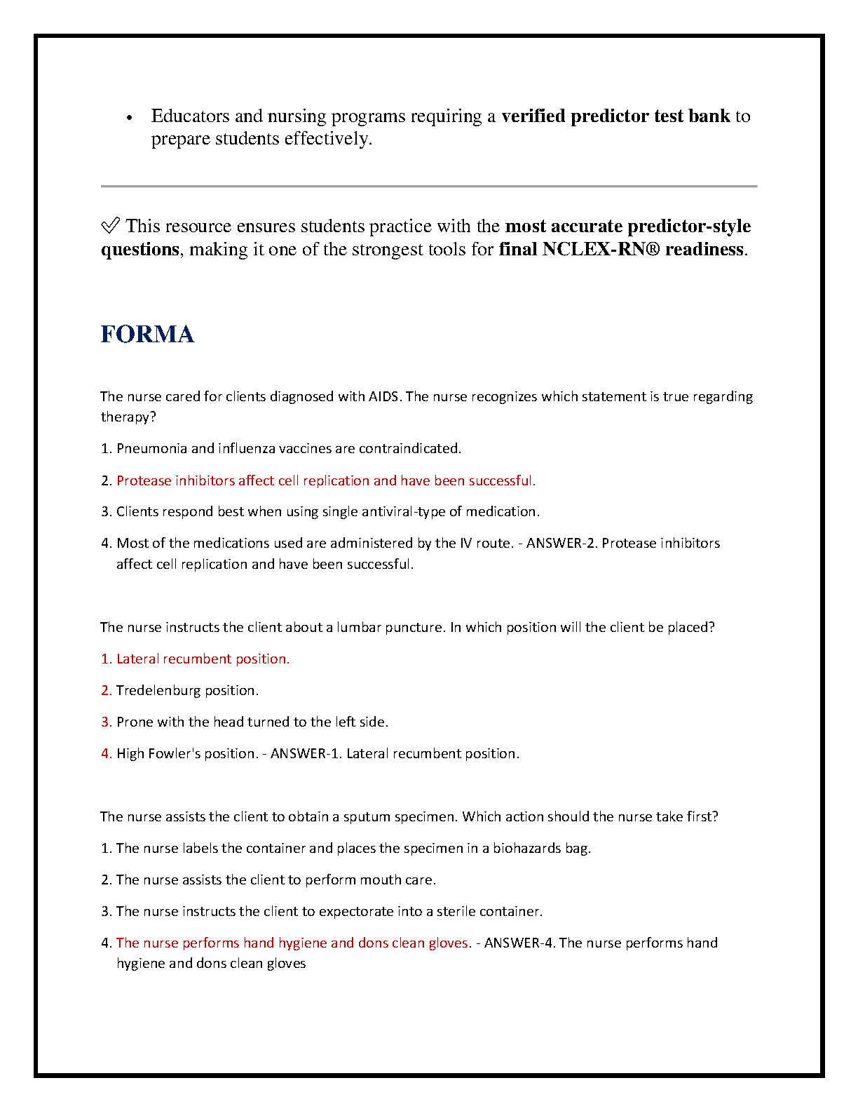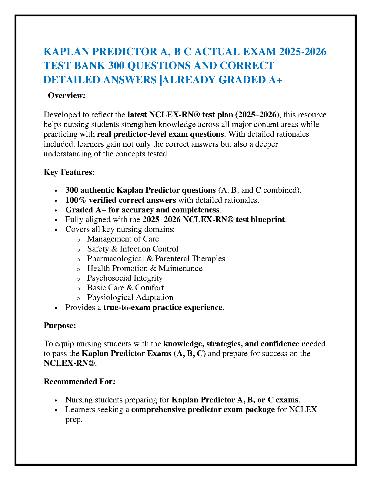 Ace your Kaplan Predictor Exams (A, B, and C) and get a head start on your NCLEX-RN preparation with our comprehensive 2025-2026 test bank. This A+ graded resource features a collection of 300 authentic, predictor-level questions, each accompanied by a 100% verified correct answer and an in-depth rationale. Our content is fully updated and aligned with the latest 2025-2026 NCLEX-RN test blueprint, ensuring you study the most relevant material. Achieve success on your first attempt with this realistic exam simulation, which covers all essential nursing domains like Management of Care, Safety & Infection Control, and Physiological Adaptation.