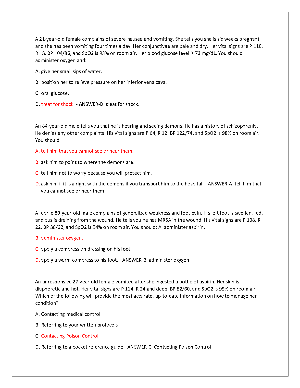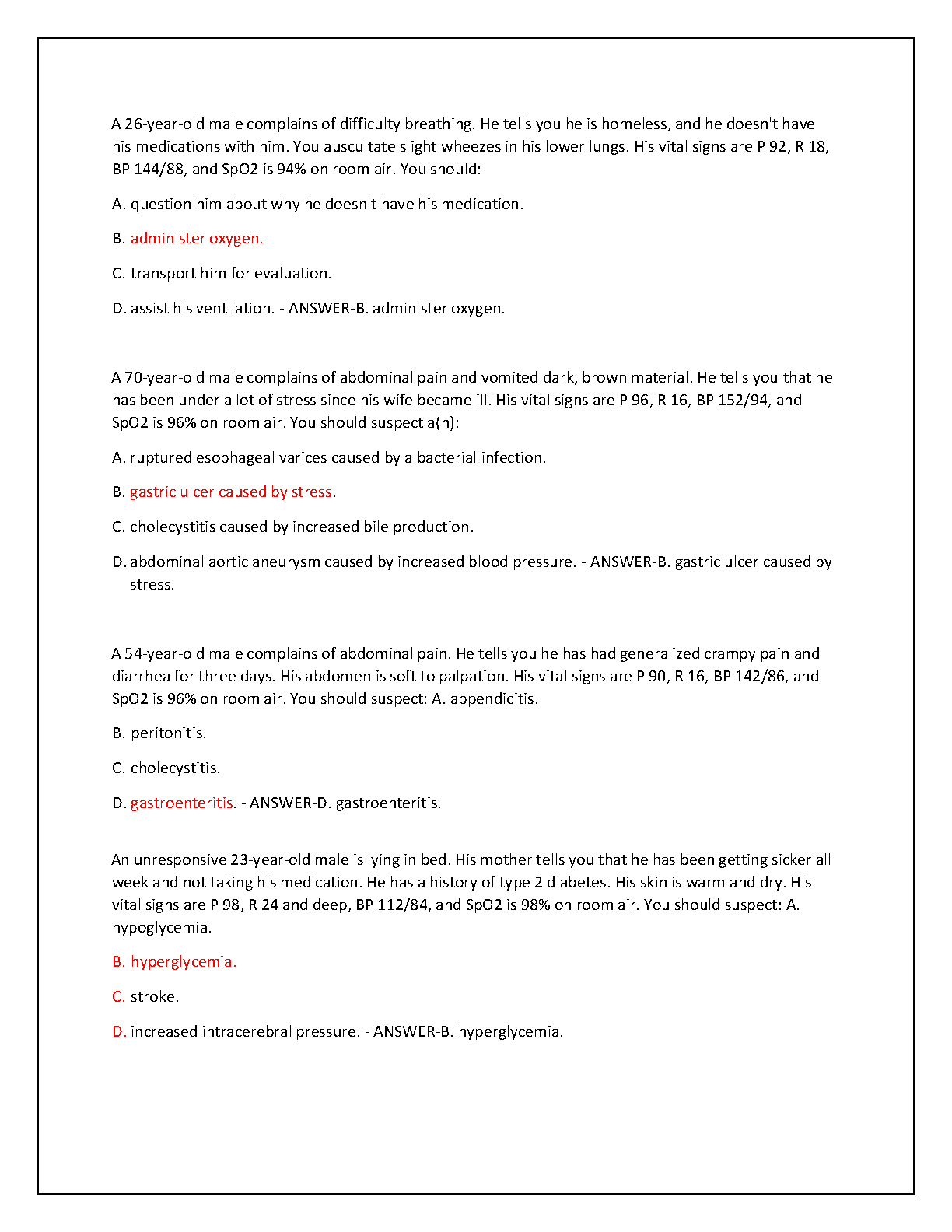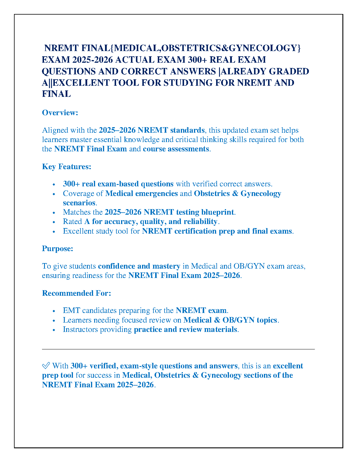 NREMT Final Exam Test Bank (Medical, Obstetrics & Gynecology) 2025-2026 Edition | Graded A+ Study Guide with 300+ Questions & Answers