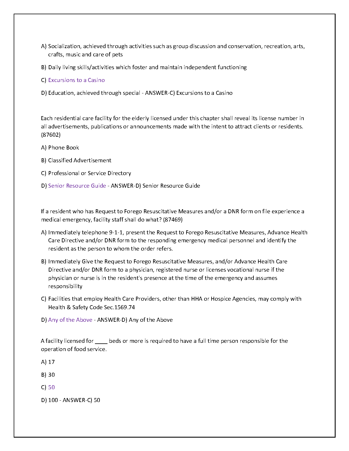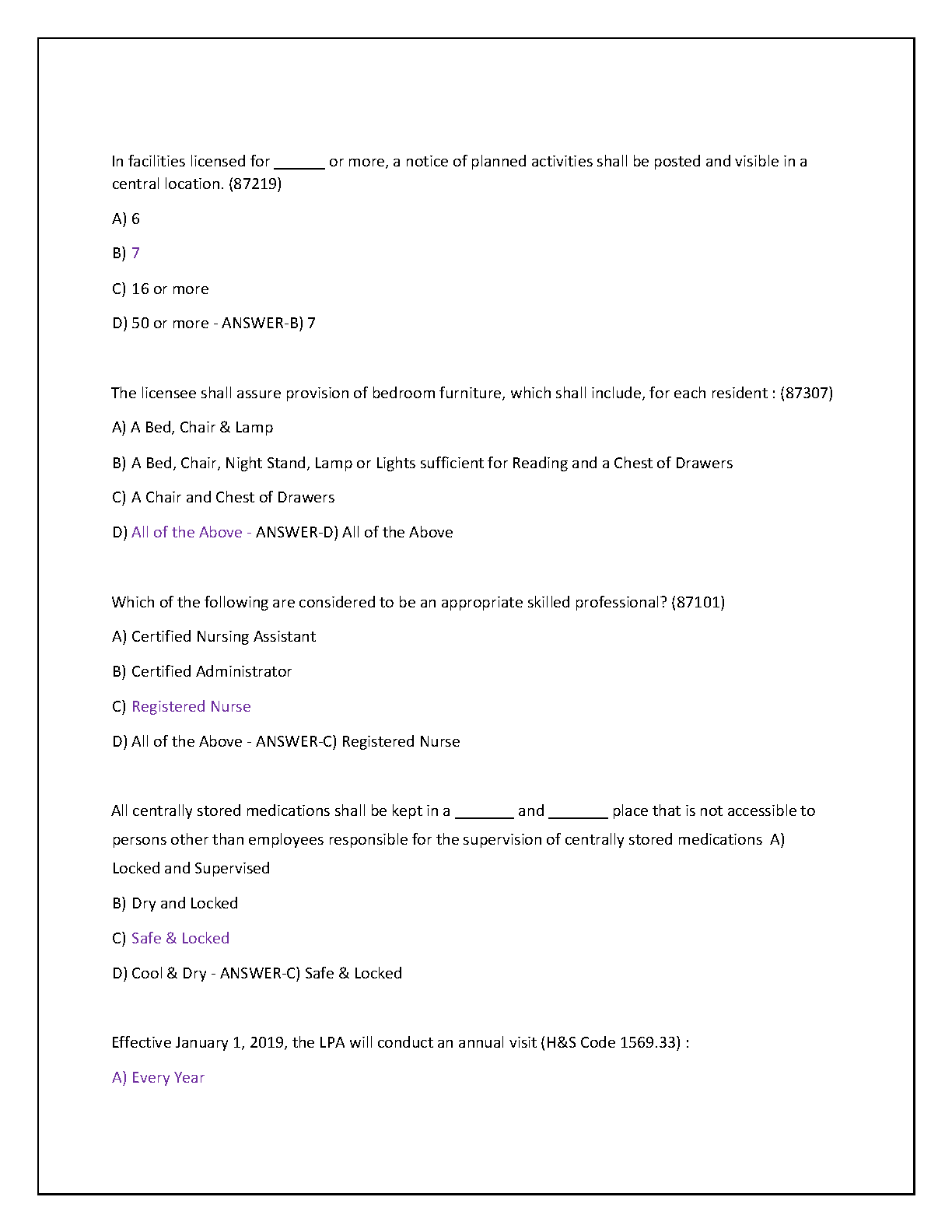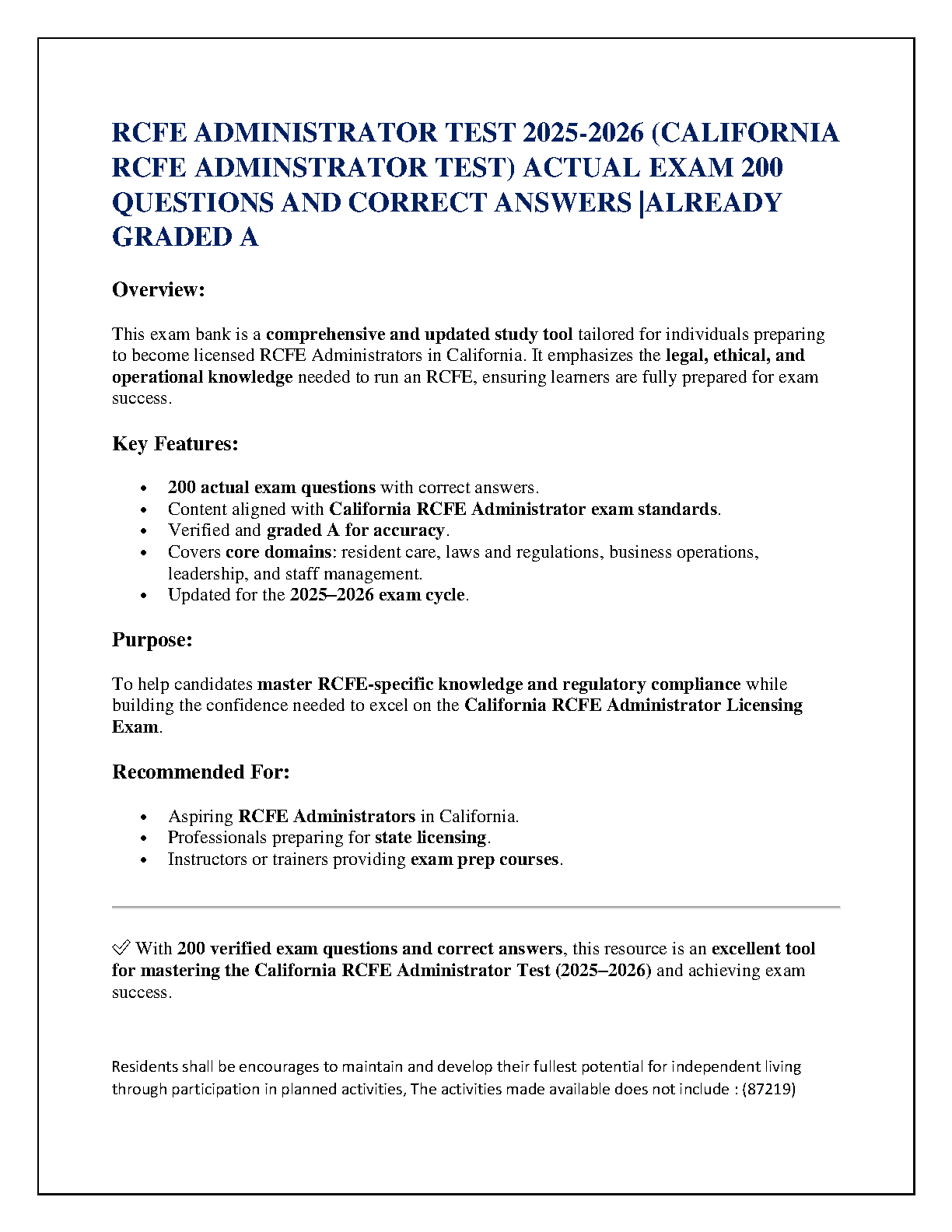 Ace your California RCFE Administrator licensing exam on the first try with our premier 2025-2026 test bank. This comprehensive study guide features 200 actual exam questions, complete with verified, A-graded answers. Designed to build your confidence, this resource covers all essential core domains, including resident care, state laws and regulations, business operations, leadership, and staff management. Master the legal, ethical, and operational knowledge required to succeed and become a licensed RCFE Administrator in California. Get fully prepared with the most up-to-date material for the 2025-2026 exam cycle.
