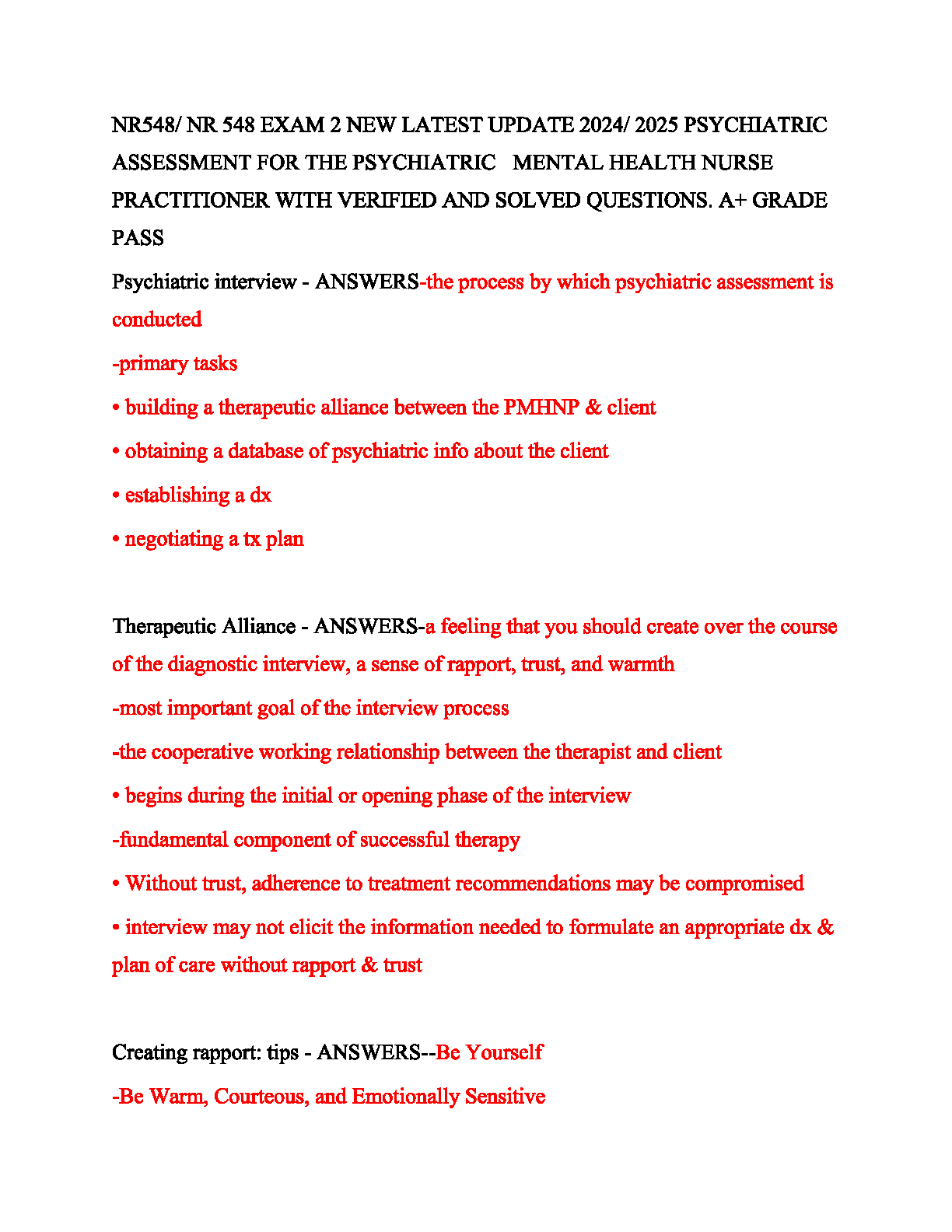 Master the essentials of psychiatric assessment with our comprehensive study guide for NR 548 Exam 2. This latest 2025/2026 resource is expertly designed for Psychiatric Mental Health Nurse Practitioner (PMHNP) students aiming for an A+ grade. Inside, you'll find detailed, verified answers and solved questions covering crucial topics such as conducting the psychiatric interview, establishing a therapeutic alliance, and creating rapport with clients. This guide simplifies complex concepts, providing the key information you need to pass your exam confidently on the first attempt and excel in your course. Avoid resits and secure your success with this indispensable study tool.