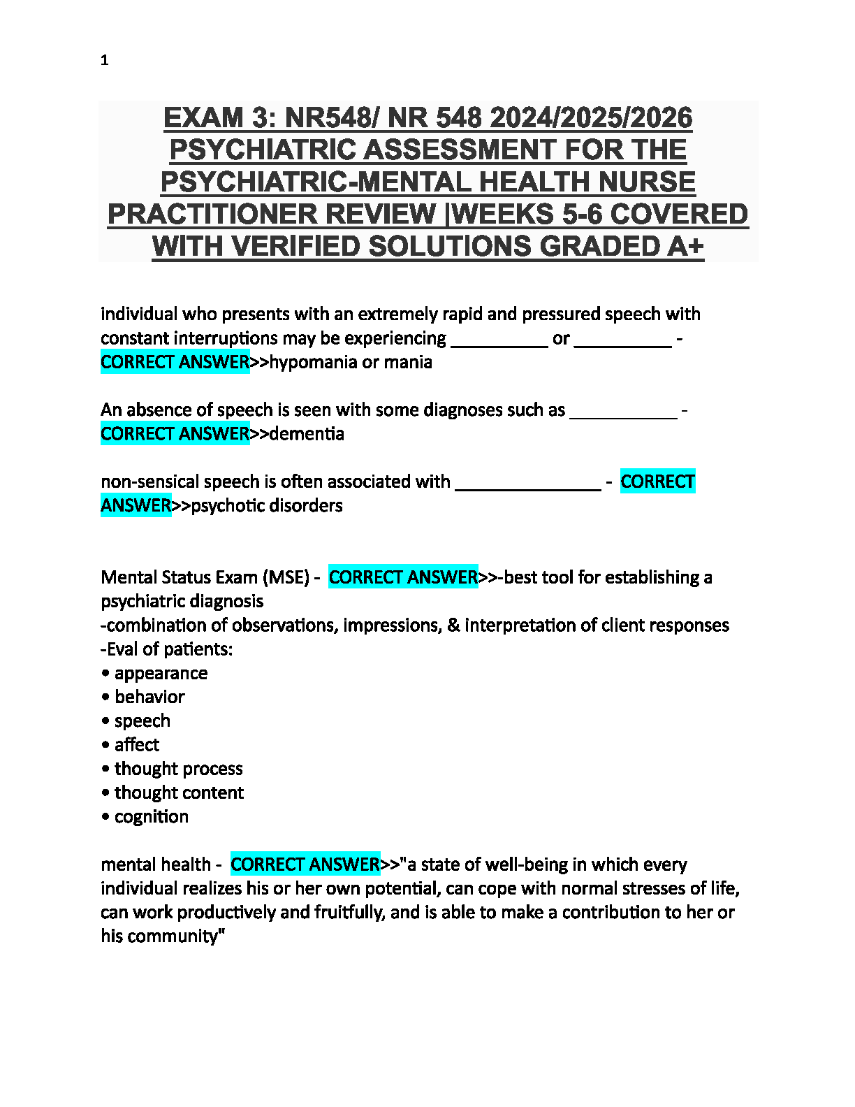 Excel in your NR548 course with this comprehensive test bank for Exam 3, focusing on Psychiatric Assessment for the Psychiatric-Mental Health Nurse Practitioner. This up-to-date 2024/2025/2026 study guide covers all essential topics from Weeks 5-6. Inside, you'll find a detailed collection of exam-style questions paired with verified, A+-grade solutions. Master key concepts such as the Mental Status Exam (MSE), differential diagnoses for symptoms like pressured speech, and foundational principles of mental health. This resource is expertly designed to help you study efficiently, grasp complex topics, and pass your exam with confidence.