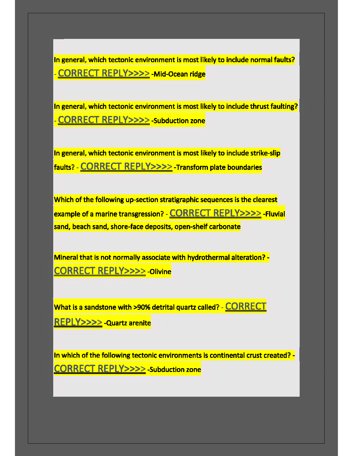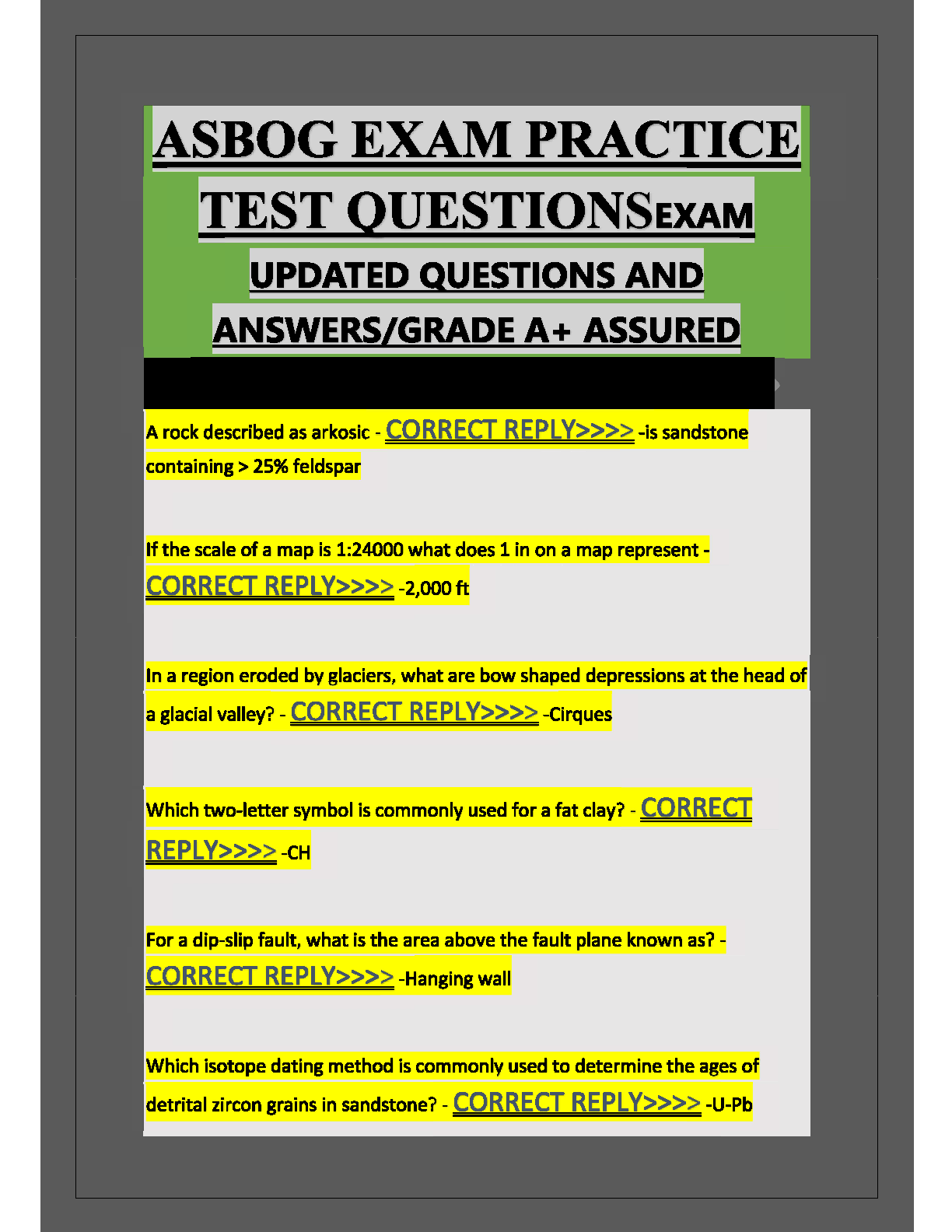Ace your National Association of State Boards of Geology (ASBOG) exam with confidence using our newly updated 2025/2026 test bank. This comprehensive resource is filled with practice questions and meticulously verified answers that cover all essential topics, from petrology and map scales to structural geology and isotopic dating. Our guide is expertly crafted to mirror the actual exam, ensuring you are fully prepared to achieve an A+ grade and pass on your very first attempt, eliminating the need for stressful resits.