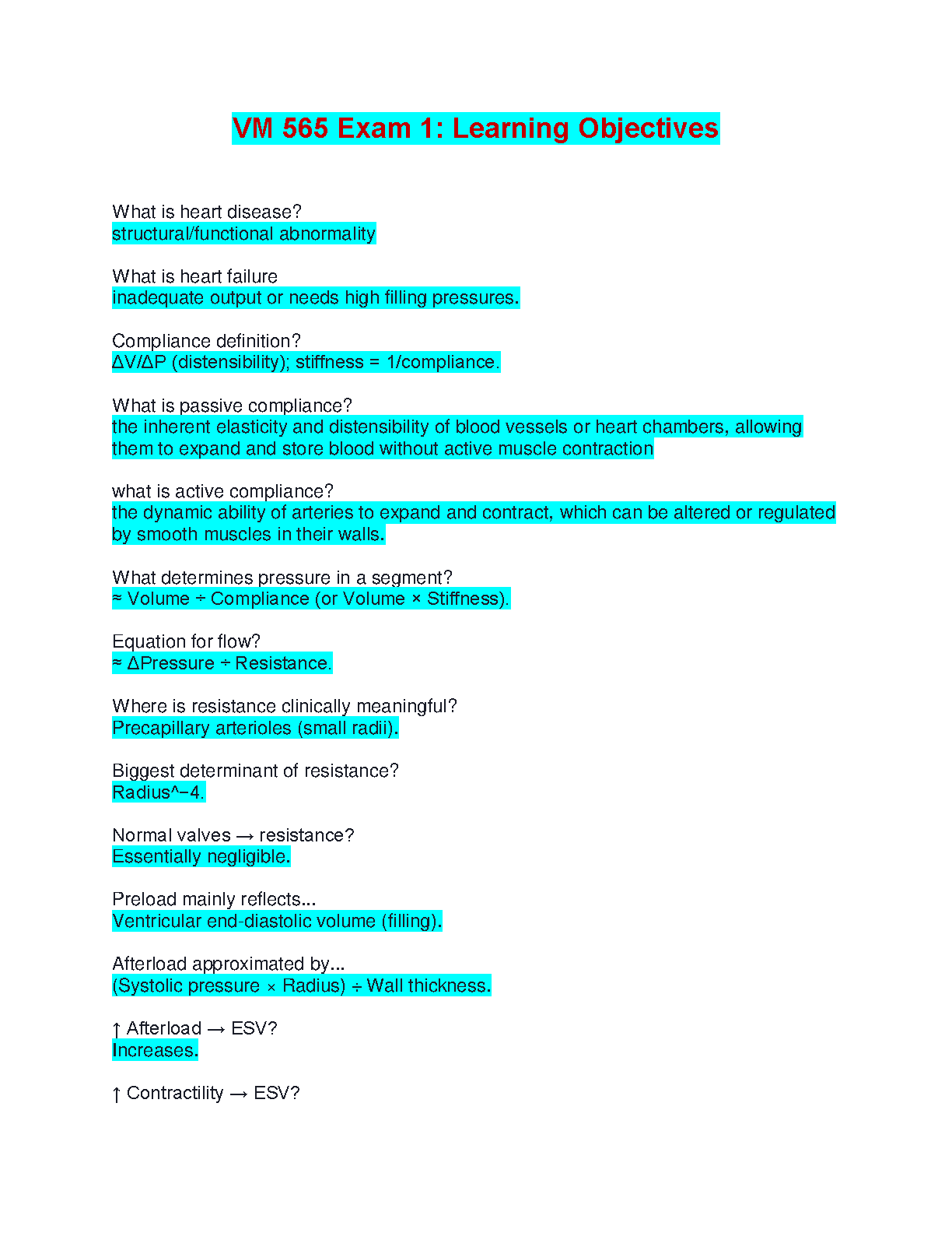 Unlock top grades in your Veterinary Medicine course with our premier exam elaboration for VM 565 Exam 1, fully updated for the 2025/2026 academic session. This indispensable guide dives deep into the core learning objectives of cardiovascular physiology, providing clear, concise answers to essential questions. Master complex topics such as heart failure, vascular compliance, blood flow dynamics, preload, and afterload. Designed to simplify difficult concepts, this resource is your key to understanding the material thoroughly and passing your exam with confidence on the first attempt, eliminating the need for costly resits.