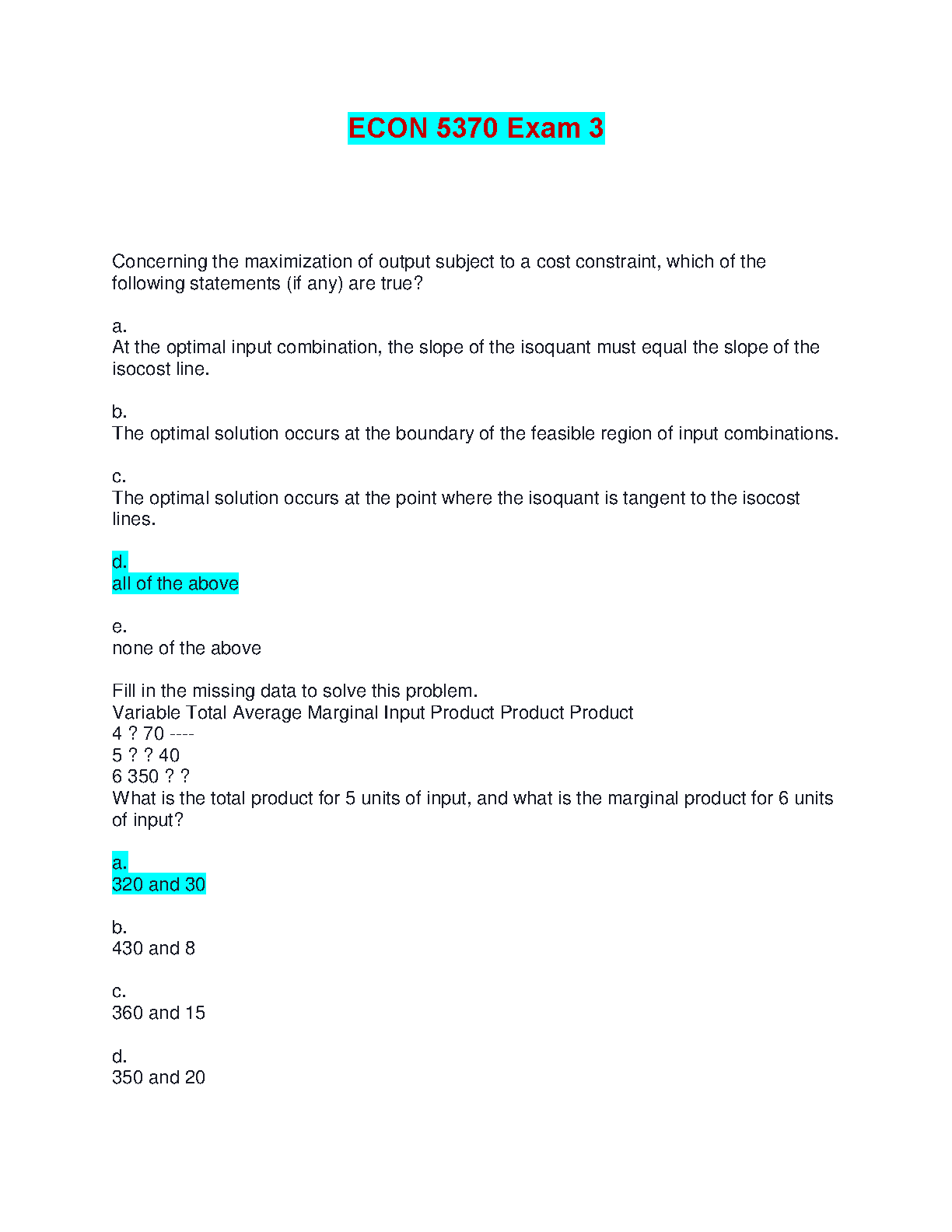 Master the core principles of managerial economics with this complete test bank for ECON 5370, Exam 3. This study aid features a collection of exam-style questions with fully verified answers, focusing on key microeconomic concepts like output maximization under cost constraints, the relationship between isoquants and isocost lines, and production theory (total, average, and marginal product). Aligned with the content of popular textbooks such as 'Managerial Economics and Business Strategy, 10th Edition' by Michael R. Baye and Jeffrey T. Prince, this resource is your key to understanding complex theories and acing your exam. Get immediate access to these essential practice questions and ensure you're prepared for success.