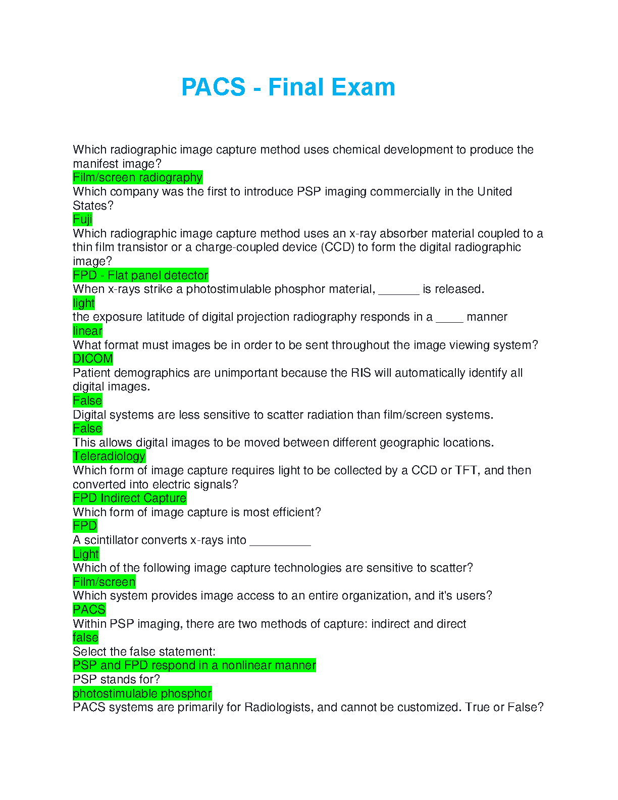 Master your PACS (Picture Archiving and Communication System) final exam with this comprehensive test bank, updated for the 2025/2026 academic year. This resource, drawing from key concepts in texts like 'Digital Imaging and PACS' by Carter & Veale, provides a detailed collection of exam-style questions and verified answers. It covers all essential topics including radiographic image capture methods (FPD, PSP), DICOM standards, digital projection radiography, and teleradiology. This study guide is expertly crafted to help you grasp complex concepts, test your knowledge effectively, and ensure you pass your final exam on the first attempt, eliminating the need for resits.