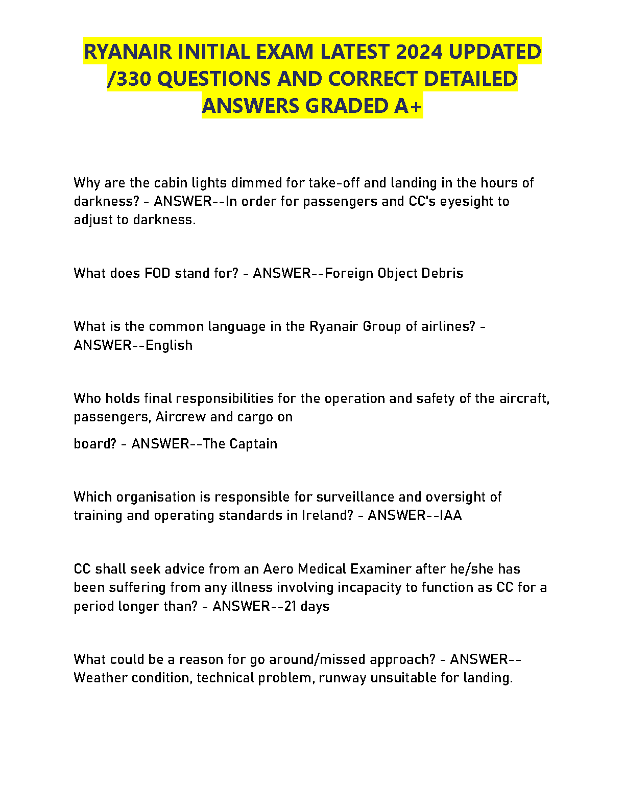 Ryanair Initial Exam Test Bank 2024: 330 Questions and Verified A+ Graded Answers