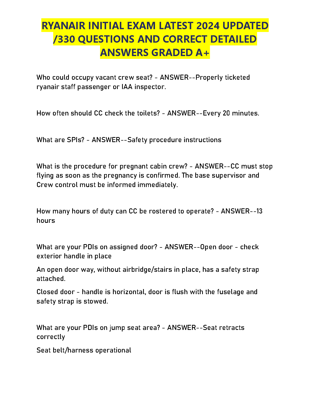 Prepare to ace your Ryanair Initial Exam with our comprehensive 2024 test bank. This essential study resource features 330 meticulously compiled questions, each complete with correct, detailed answers that have been graded A+. Covering all critical topics for aspiring cabin crew—from safety protocols and emergency procedures to the CC chain of command—this guide is designed to give you the ultimate advantage. Master the material, build your confidence, and secure your position by passing your exam with top marks on the very first attempt.