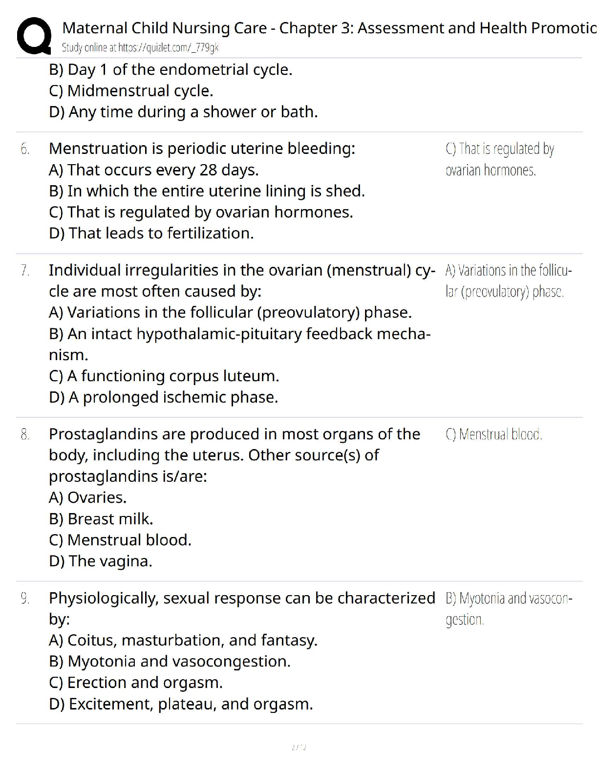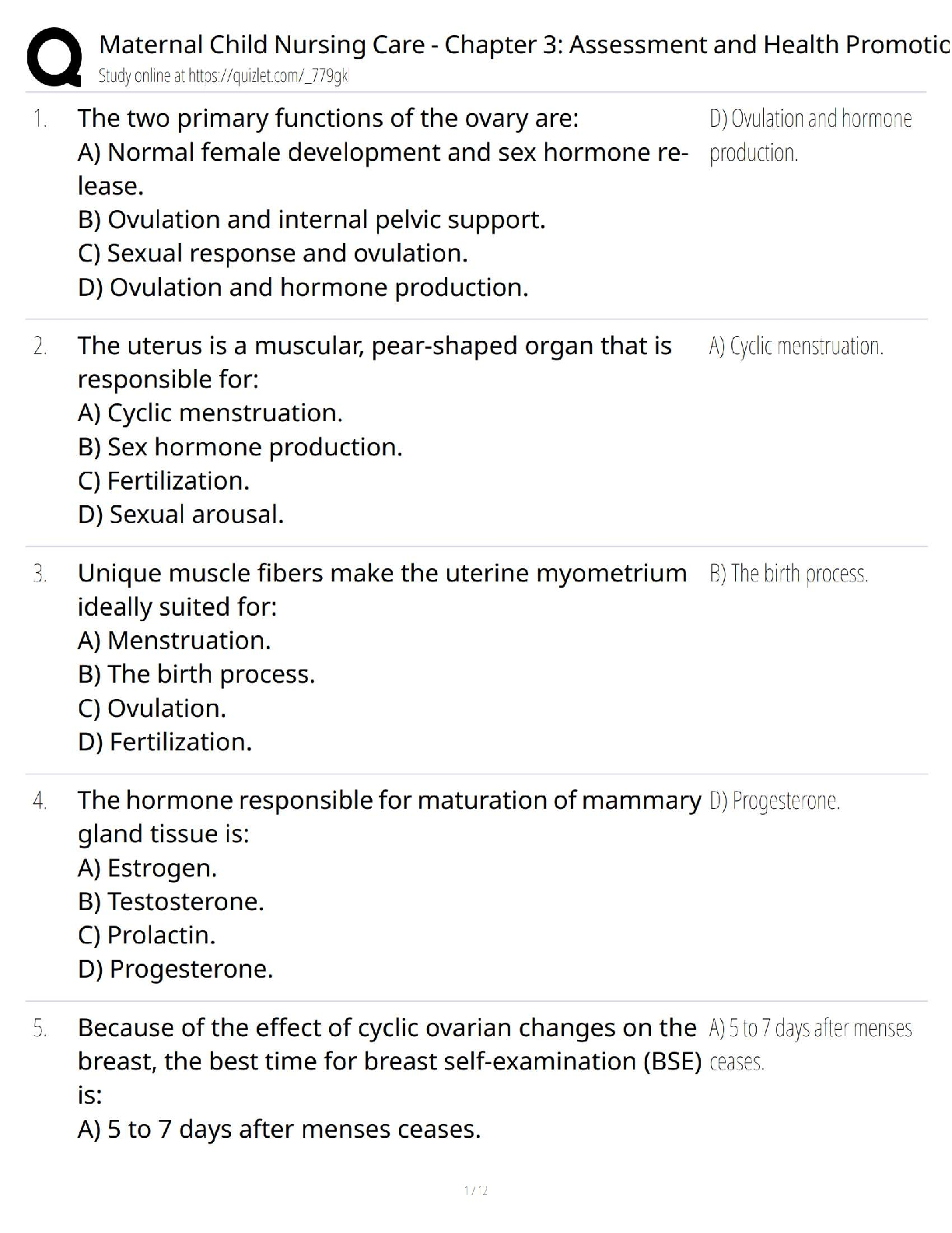Unlock success in your nursing course with this comprehensive test bank for Chapter 3: Assessment and Health Promotion, from the acclaimed 'Maternal Child Nursing Care, 7th Edition' by Perry, Hockenberry, Lowdermilk, and Wilson. This essential study tool provides a full collection of exam-style questions complete with verified answers, covering critical topics such as the female reproductive system, hormonal regulation, and key health promotion strategies. Designed to help you master complex concepts and excel in your exams, this resource is perfect for acing your tests on the first try and avoiding resits. Get instant access to prepare effectively and boost your confidence in maternal and child nursing.