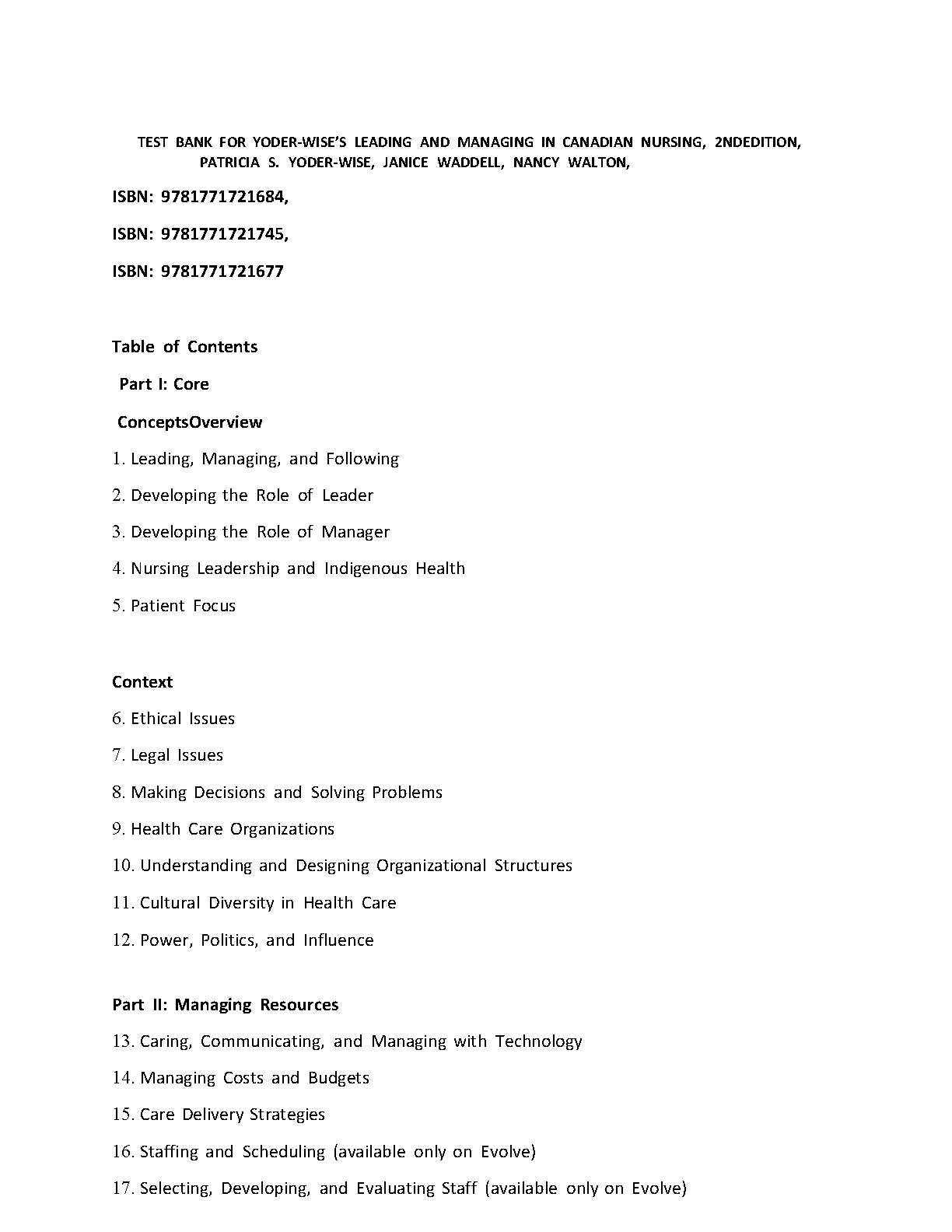 Test Bank for Yoder-Wise's Leading and Managing in Canadian Nursing, 2nd Edition by Janice I. Waddell & Nancy A. Walton