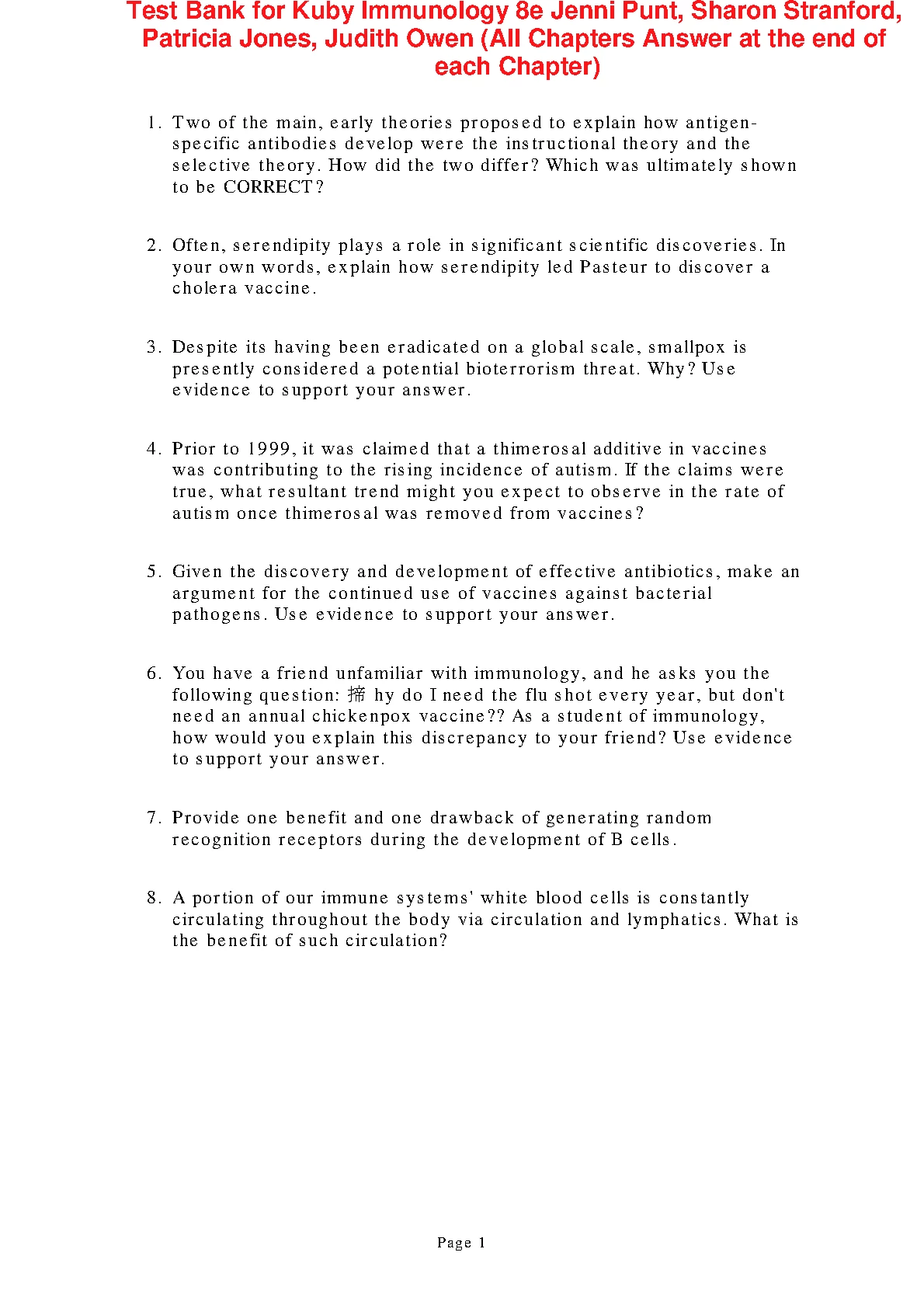 Test Bank for Kuby Immunology 8TH EDITION BY Jenni Punt, Sharon Stranford, Patricia Jones, Judith Owen (All Chapters)
