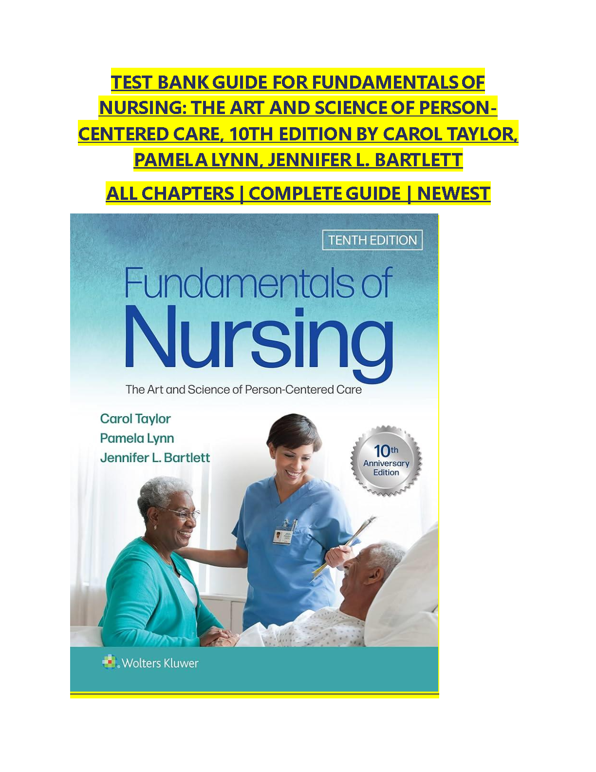 Instantly download the complete Test Bank for the 10th Edition of Fundamentals of Nursing: The Art and Science of Person-Centered Care by Taylor, Lynn, and Bartlett. This comprehensive resource contains a vast collection of exam-style questions and detailed answers covering every chapter. It's the ultimate study tool to help you master core nursing concepts, excel on your exams, and solidify your understanding of person-centered care.
