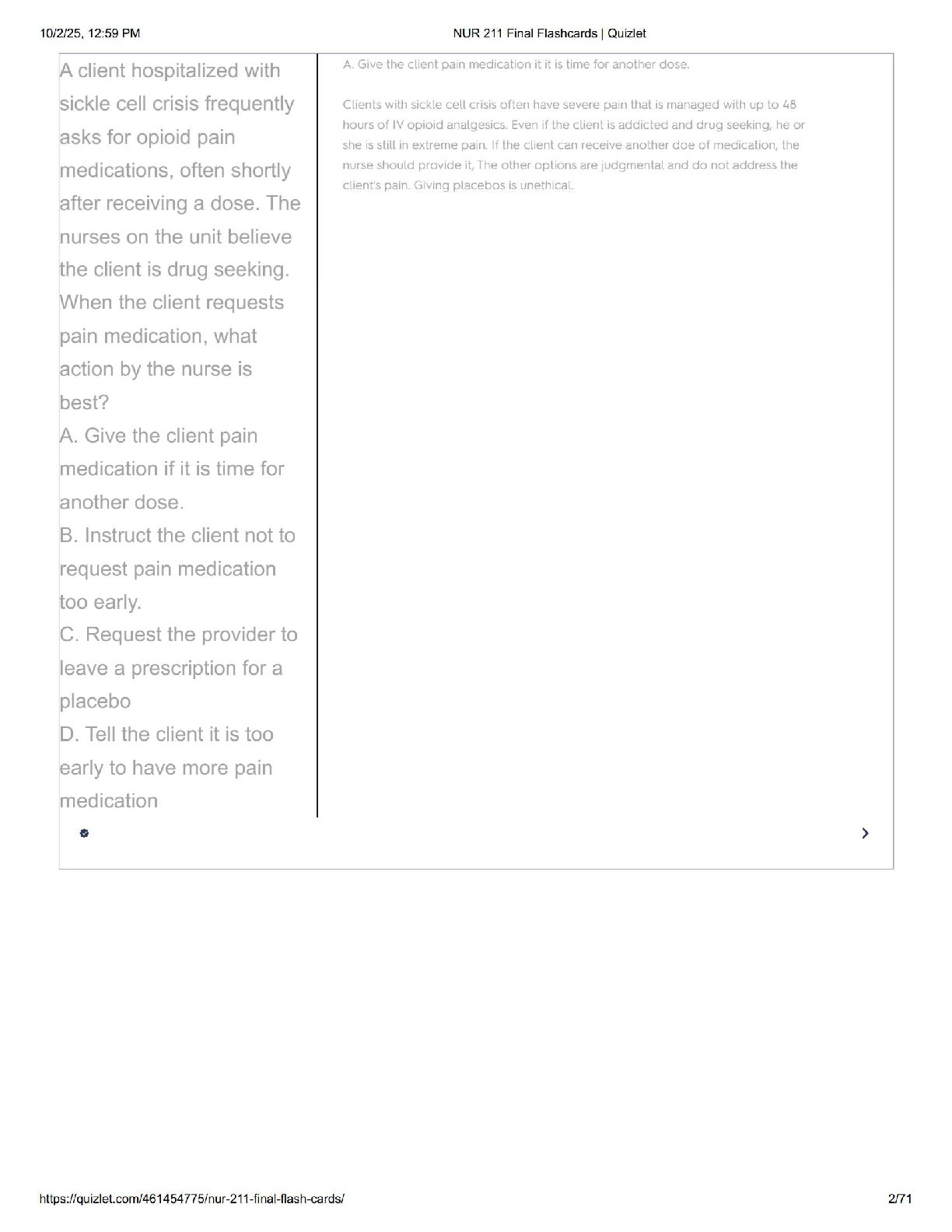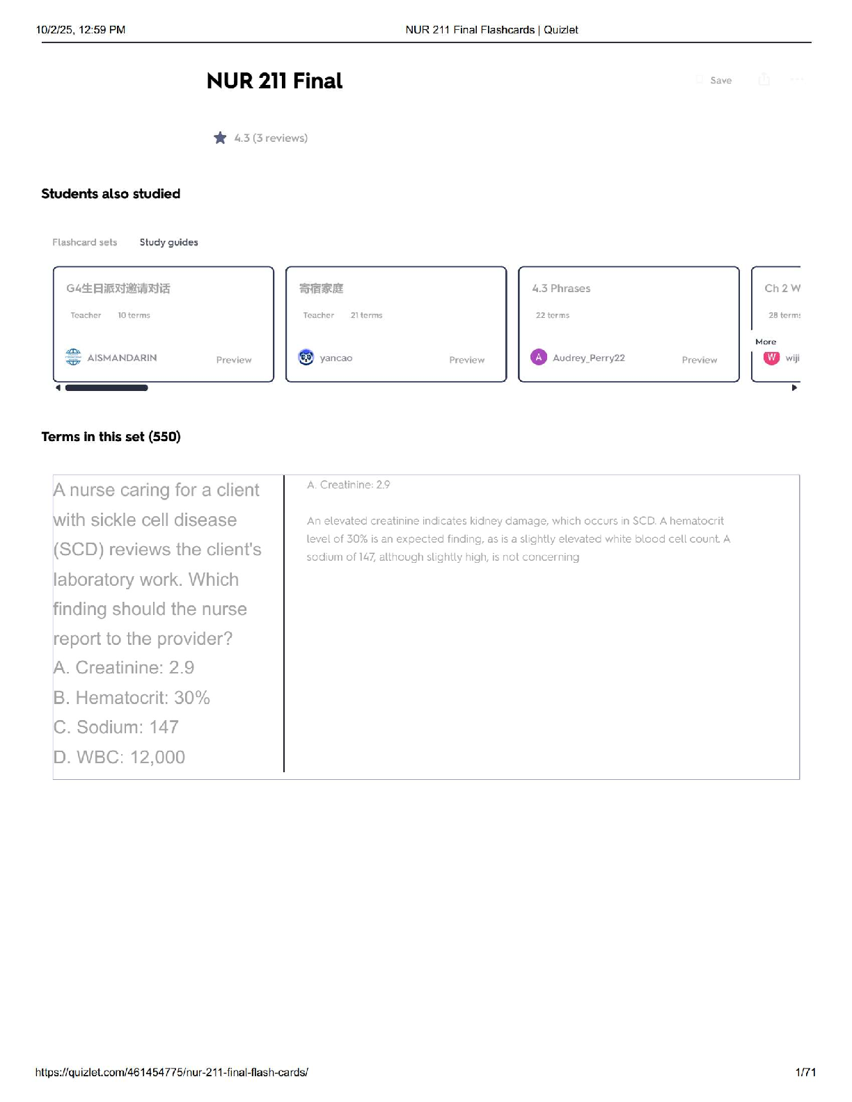 Master the material for your NUR 211 final exam with this comprehensive test bank, featuring 550 detailed flashcards. This essential study resource provides a vast collection of practice questions and fully explained answers with rationales, covering all key nursing concepts, including the interpretation of lab results for conditions like Sickle Cell Disease. Elevate your study sessions and gain the confidence needed to excel and pass your final exam on the first try.