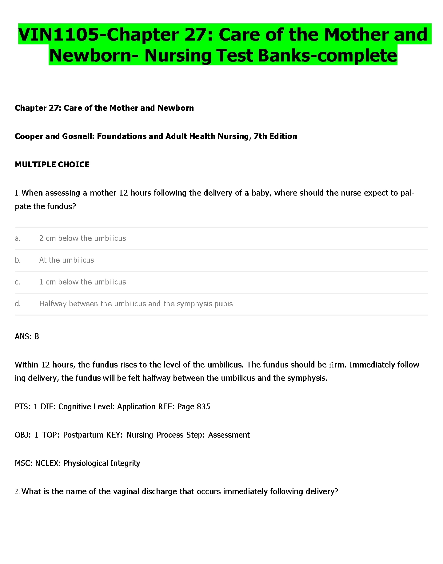 Cooper and Gosnell: Foundations and Adult Health Nursing, 7th Edition VIN1105-Chapter 27: Care of the Mother and Newborn- Nursing Test Banks-complete