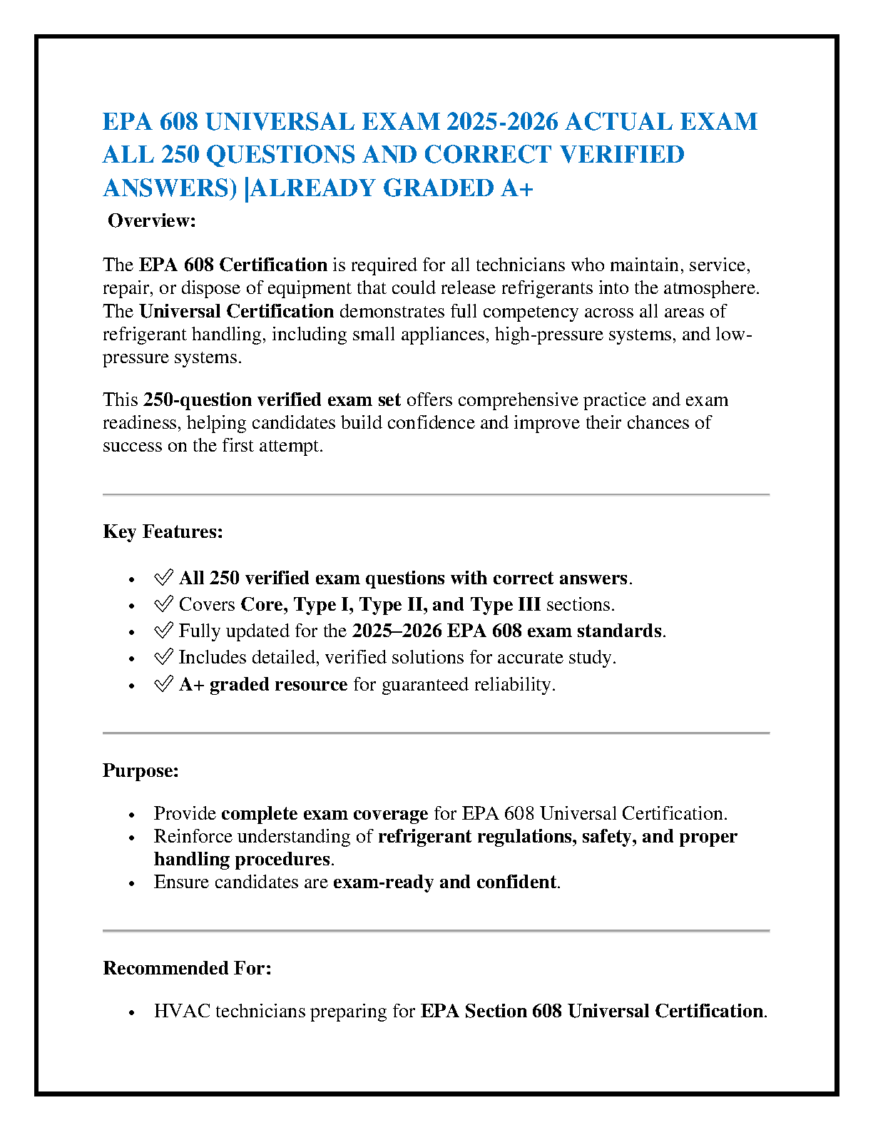 EPA 608 Universal Exam 2025-2026 Test Bank: 250 A+ Graded Questions & Verified Answers for First-Attempt Success