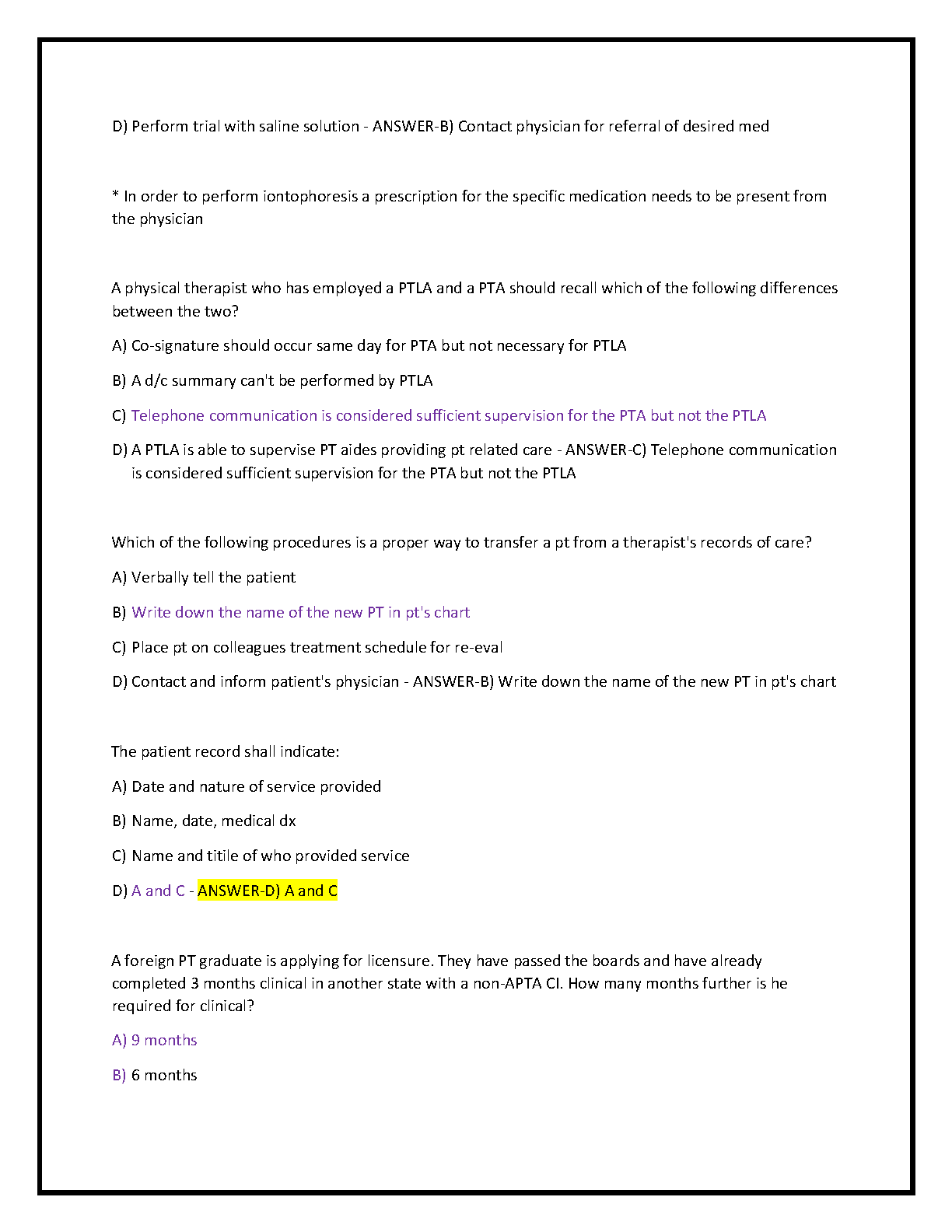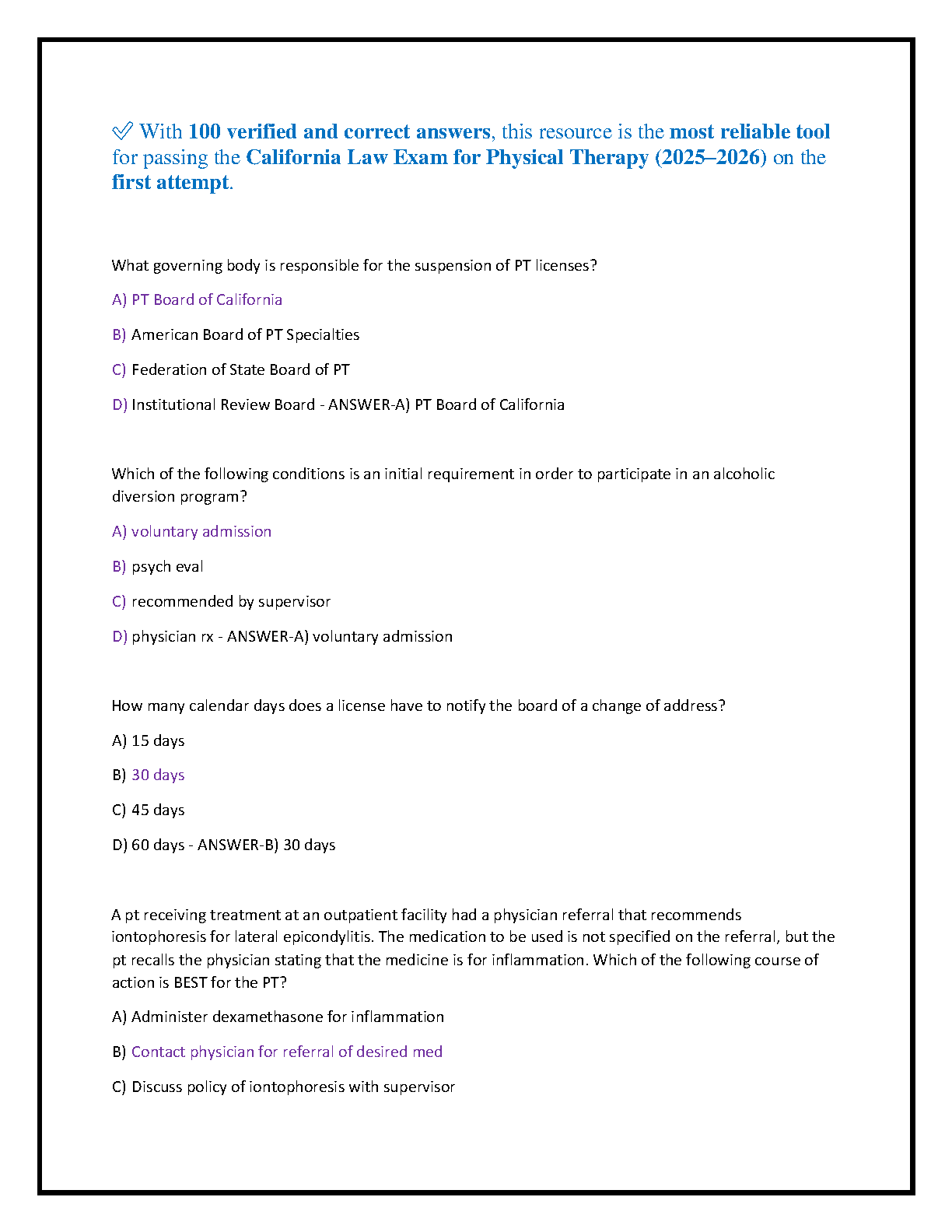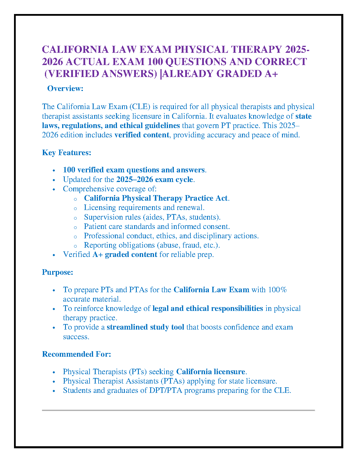 Master the California Law Exam (CLE) for Physical Therapy and secure your license with our premier 2025-2026 test bank. This guide features 100 meticulously verified exam questions and correct answers, all graded A+ to ensure the highest accuracy. Updated for the latest exam cycle, it provides comprehensive coverage of the California Physical Therapy Practice Act, licensing requirements, supervision rules, and professional ethics. This streamlined study tool is expertly designed for Physical Therapists (PTs), Physical Therapist Assistants (PTAs), and students to boost confidence and guarantee success on the first attempt, helping you avoid costly resits.