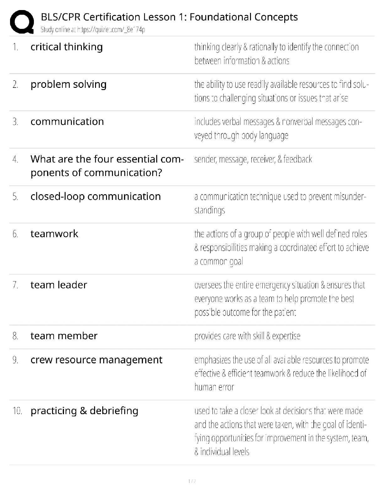Ace your BLS/CPR certification exam on the first attempt with our comprehensive study guide updated for the 2025/2026 academic year. This resource covers Lesson 1: Foundational Concepts, providing clear and concise definitions for essential skills like critical thinking, problem-solving, and effective communication. Master key principles including closed-loop communication, teamwork dynamics, crew resource management, and the importance of debriefing to ensure you're fully prepared for your certification test.