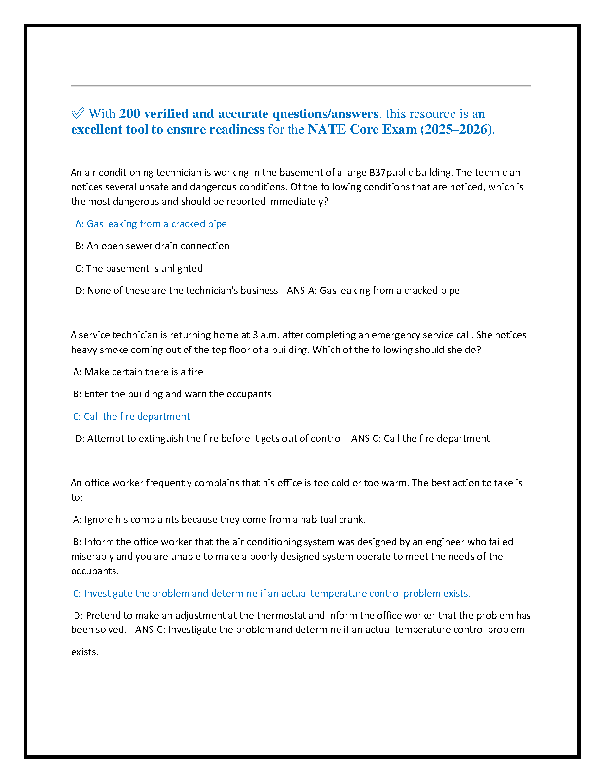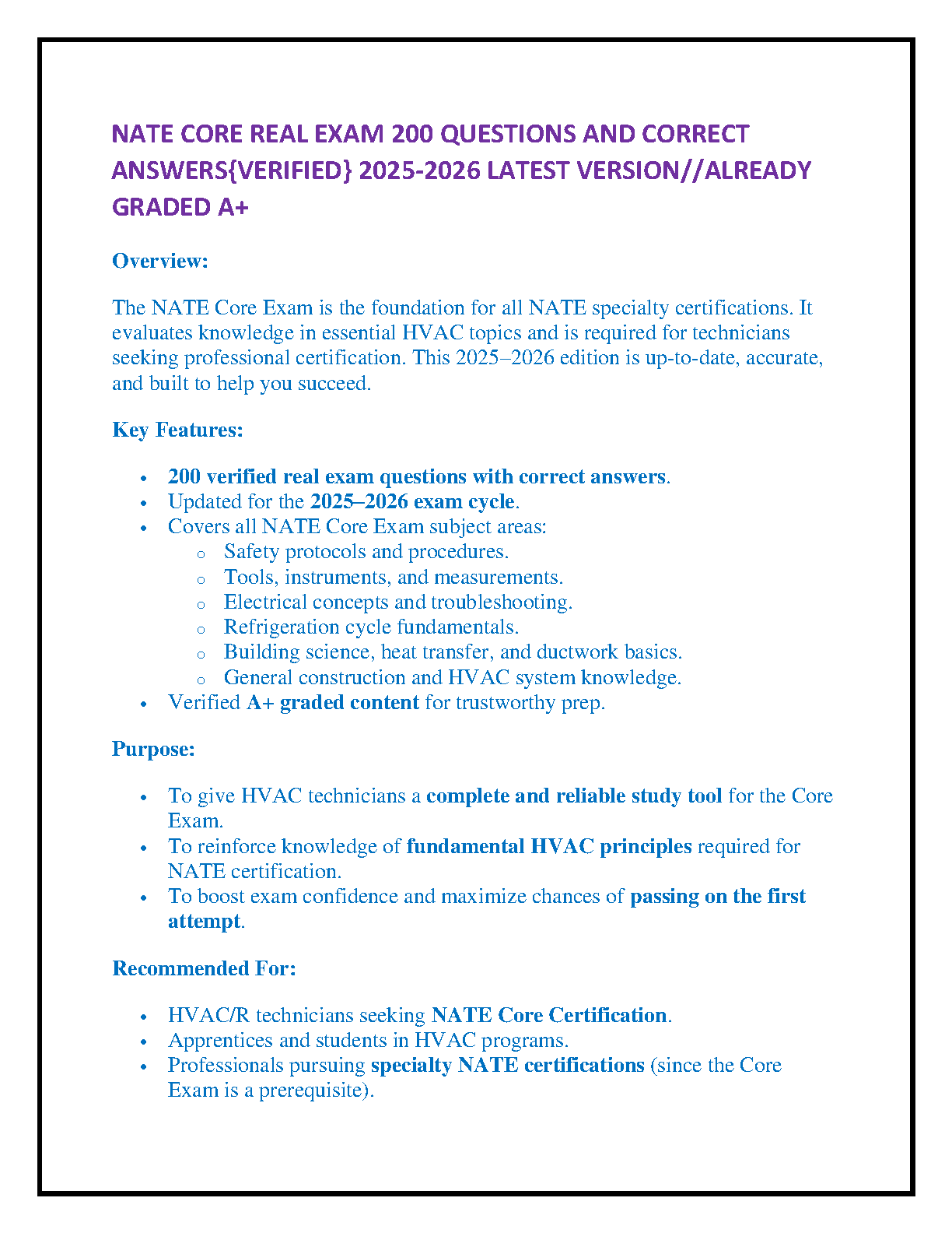 Prepare to ace your NATE Core Exam with our comprehensive test bank, fully updated for the 2025-2026 academic year. This essential study guide is your key to passing on the first attempt and avoiding costly resits. Inside, you'll find 200 meticulously verified, A+ graded questions complete with correct answers, covering all critical subject areas of the NATE Core Exam. Master topics such as safety protocols, tools and measurements, electrical troubleshooting, refrigeration fundamentals, building science, and general HVAC system knowledge. This resource is perfect for aspiring and current HVAC/R technicians, apprentices, and students seeking to build confidence and achieve their NATE certification. Get the reliable, up-to-date prep you need to succeed!