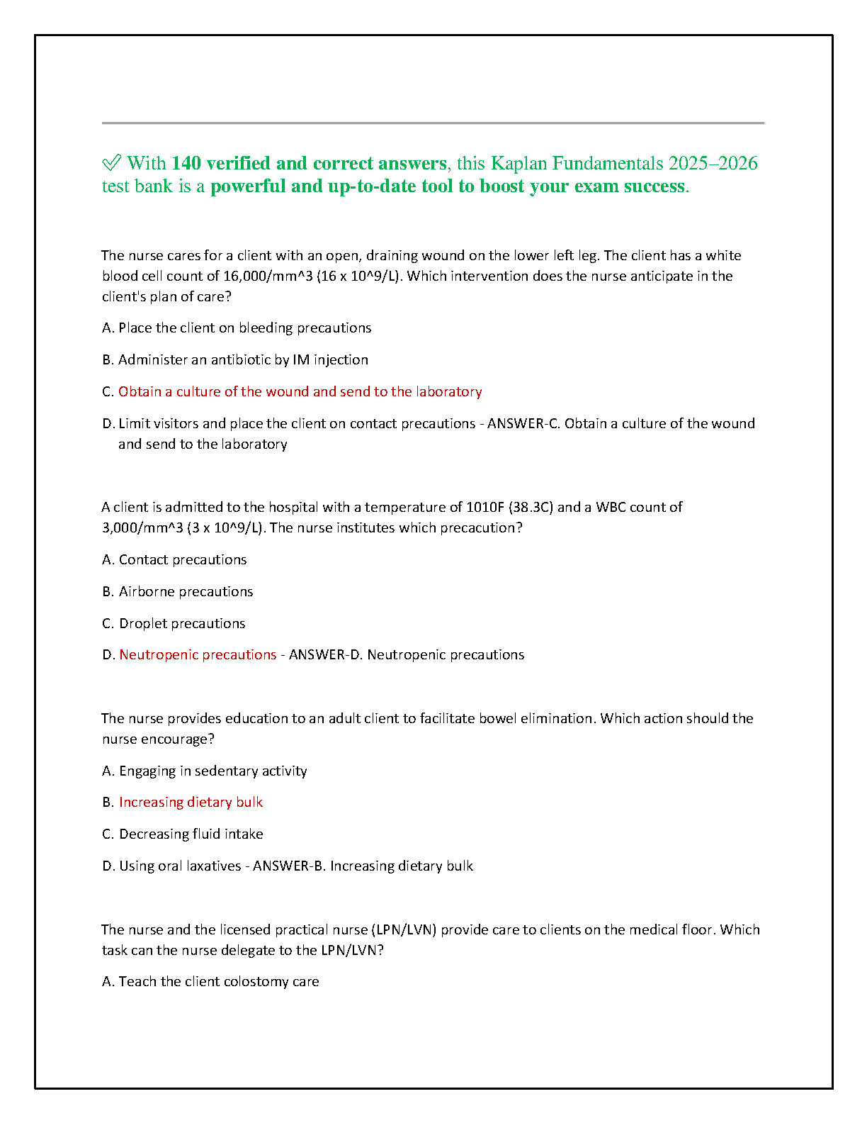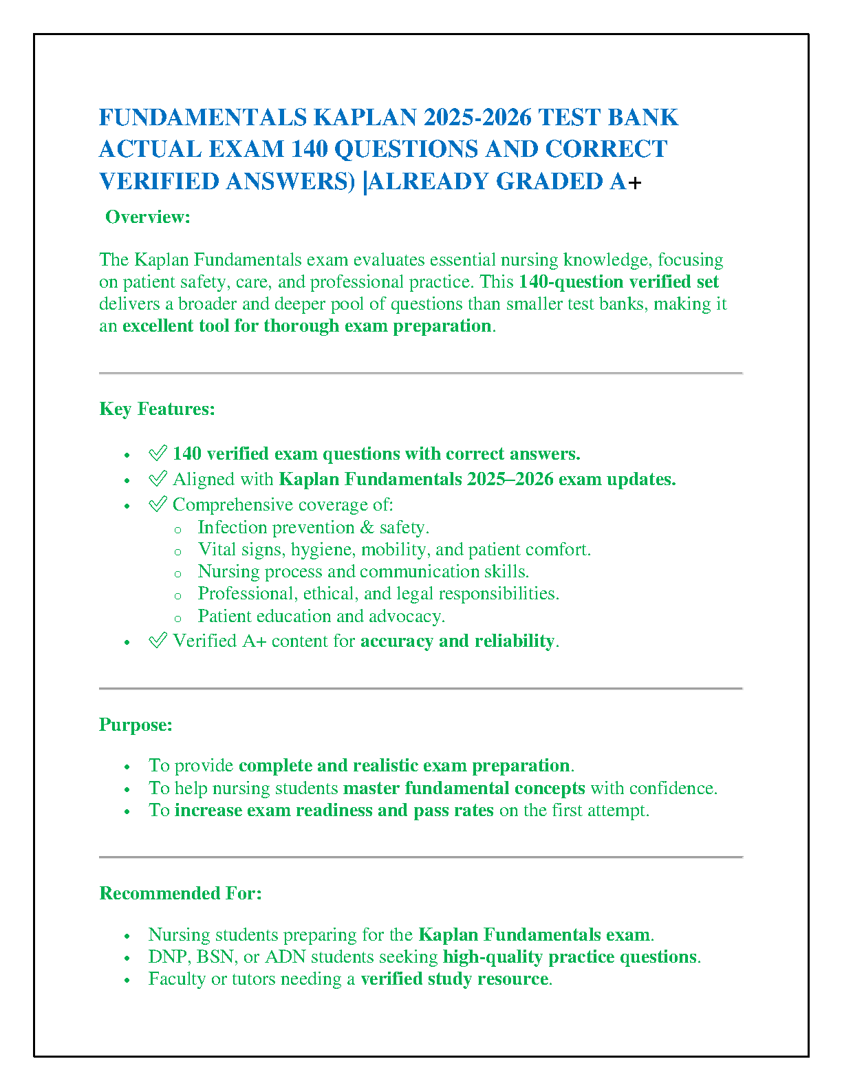 Unlock success in your nursing studies with the latest 2025-2026 Kaplan Fundamentals Test Bank. This essential study guide is designed to help you ace your exam on the first try. Inside, you'll find a comprehensive set of 140 actual exam questions with verified, A+ graded answers. This resource covers all critical areas, including infection prevention, patient safety, vital signs, the nursing process, communication, professional ethics, and patient advocacy. Perfectly aligned with the newest curriculum, it's the ultimate tool for DNP, BSN, and ADN students seeking a reliable and thorough way to prepare and build confidence. Get the A+ grade you deserve and avoid resits with this indispensable study aid.