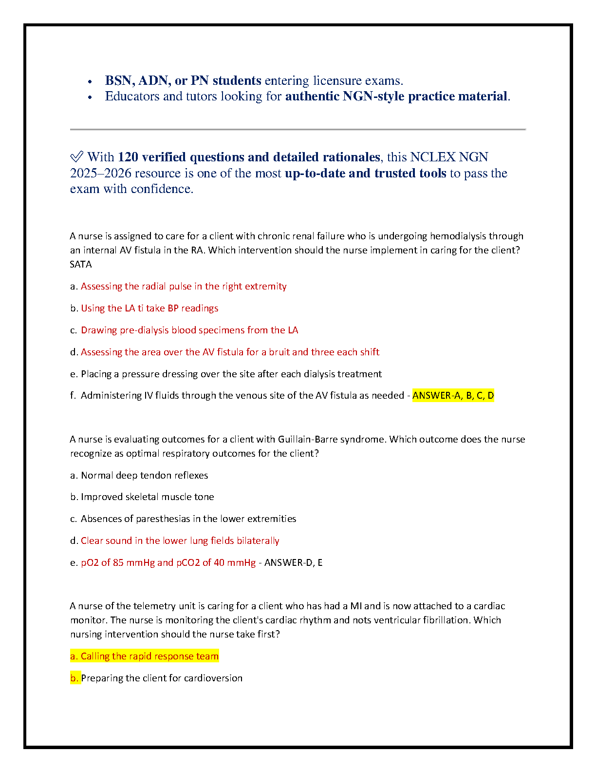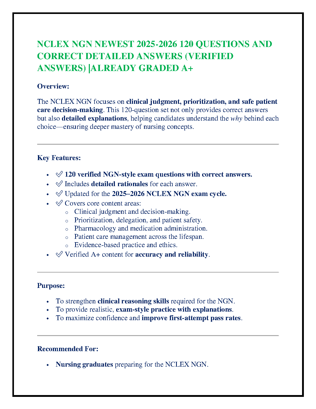Ace your NCLEX NGN exam on the very first attempt with our latest 2025-2026 study guide. This comprehensive resource features 120 meticulously crafted, NGN-style practice questions, each accompanied by correct answers and detailed rationales to deepen your understanding. Our A+ graded content is fully updated for the 2025-2026 exam cycle, ensuring you study the most current material. Sharpen your skills in critical areas such as clinical judgment, prioritization, delegation, pharmacology, and patient safety. Designed for nursing graduates, this guide provides realistic exam practice to build your confidence, strengthen your clinical reasoning, and maximize your chances of success.