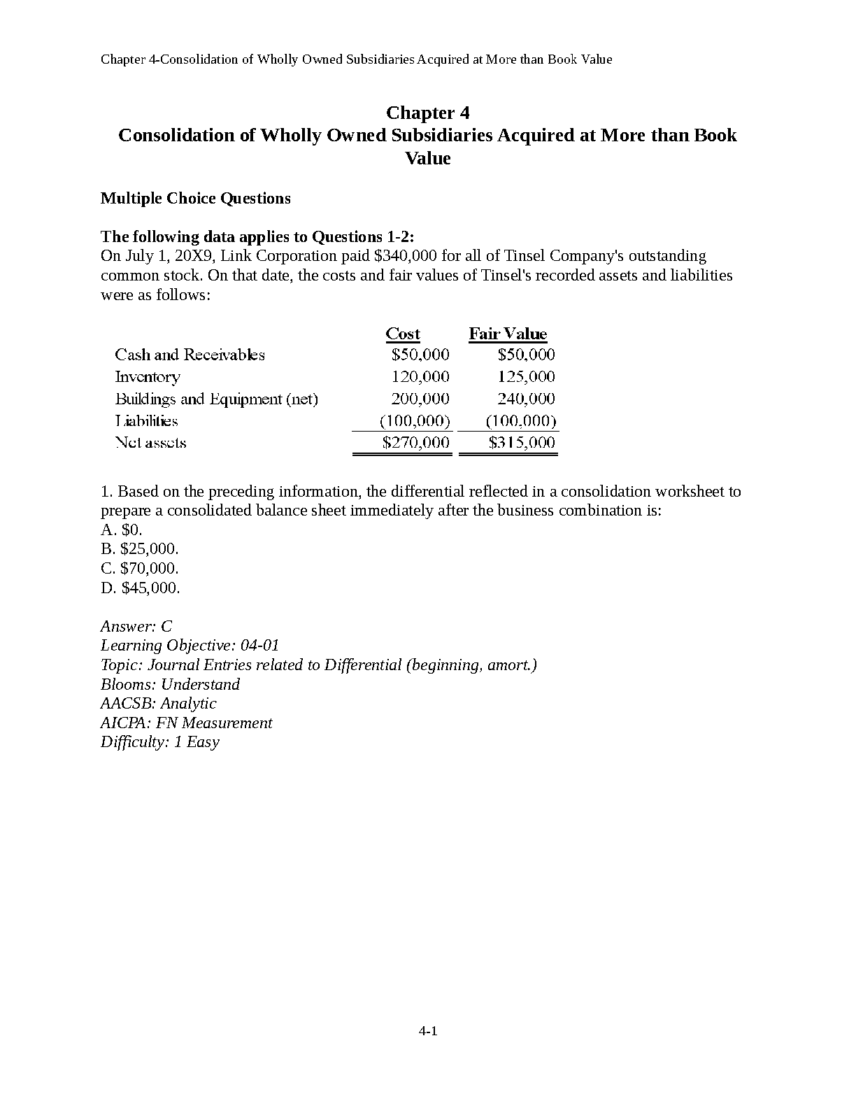 TEST BANK: Chapter 4-Consolidation of Wholly Owned Subsidiaries Acquired at More than Book Value