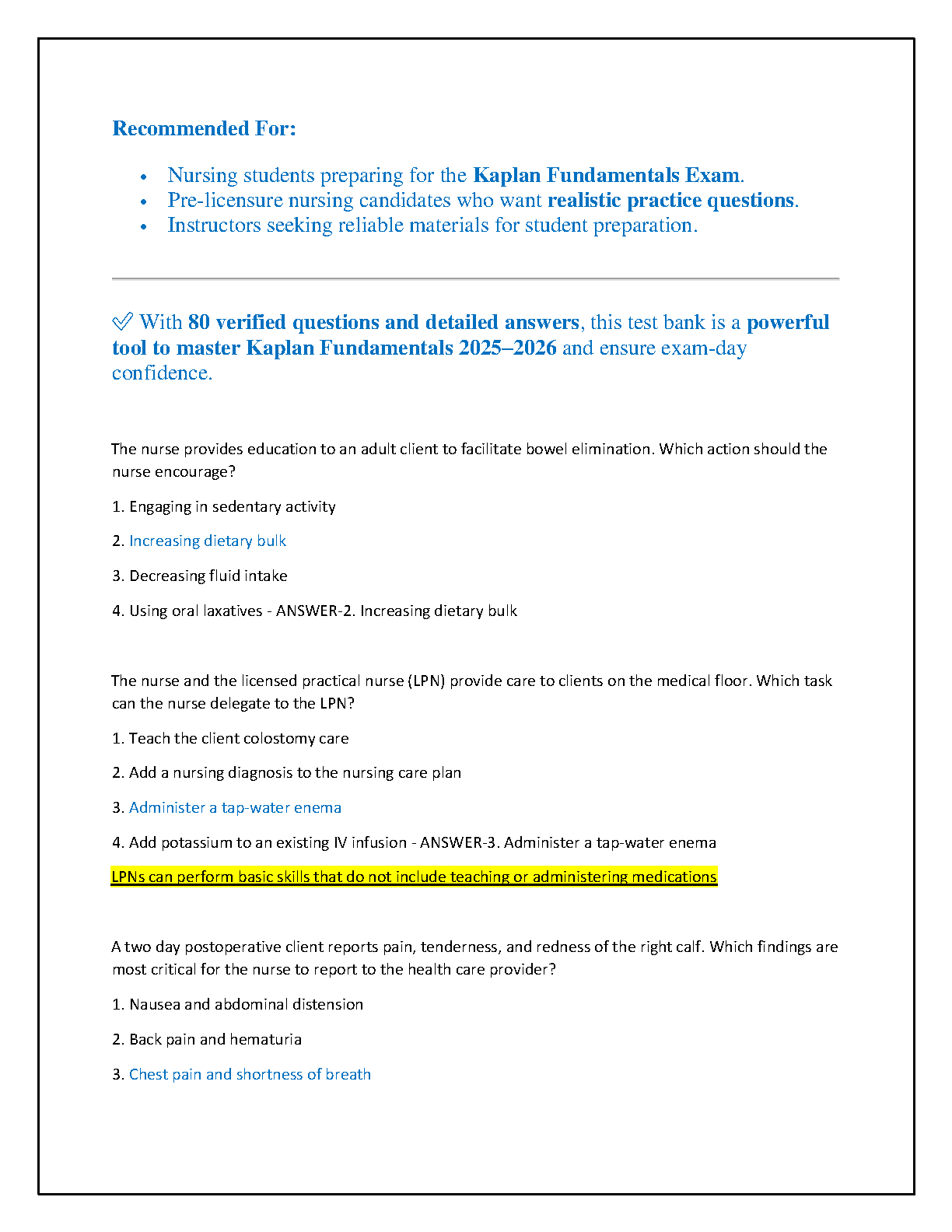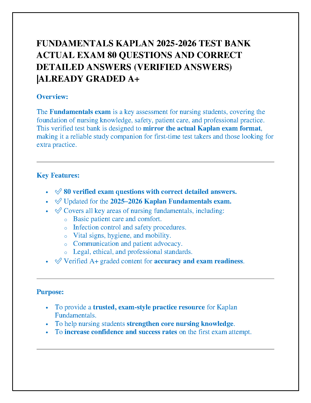 Master your nursing fundamentals exam on the first try with the latest 2025-2026 Kaplan Test Bank. This essential study guide contains 80 verified, A+ graded exam questions complete with correct, detailed answers and rationales. Designed to perfectly mirror the actual exam format, this resource covers all core areas: patient care, safety procedures, infection control, communication, and legal/ethical standards. Increase your confidence and ensure success by studying with this trusted tool, your key to passing the Kaplan Fundamentals exam without needing a resit.
