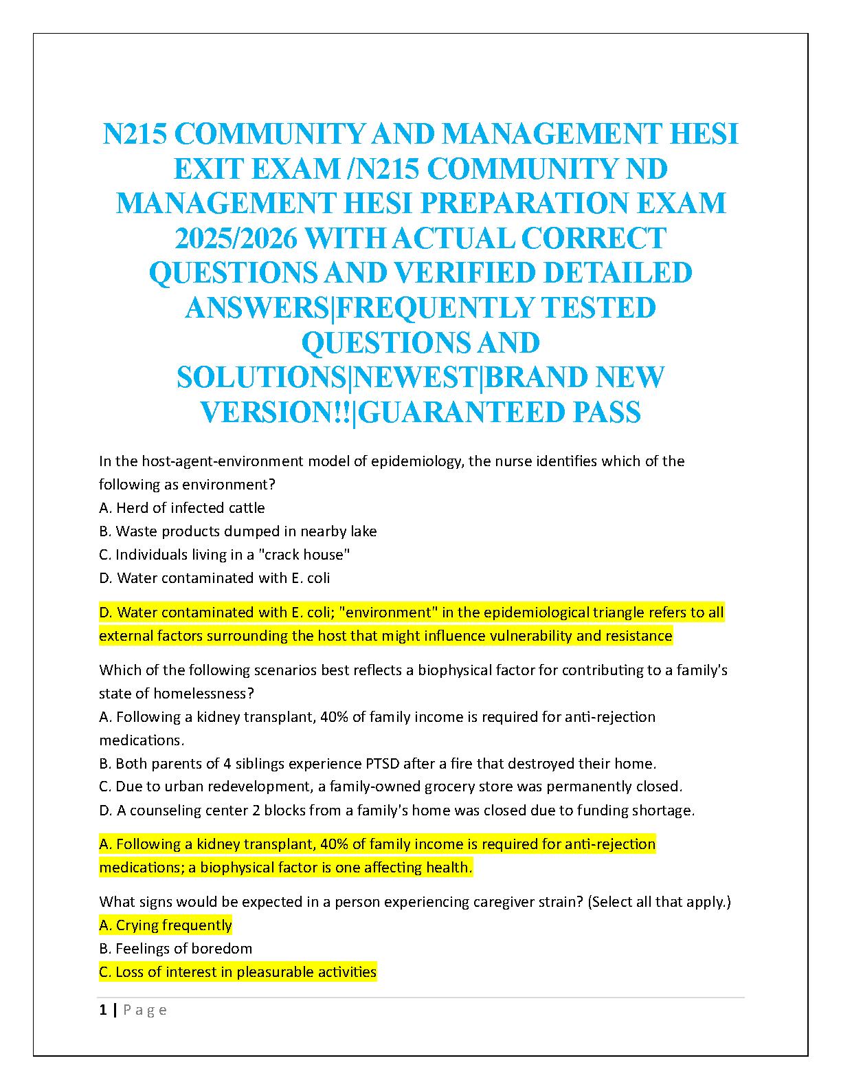N215 Community and Management HESI Exit Exam Study Guide 2025/2026: Master Frequently Tested Questions and Answers to Pass on Your First Attempt