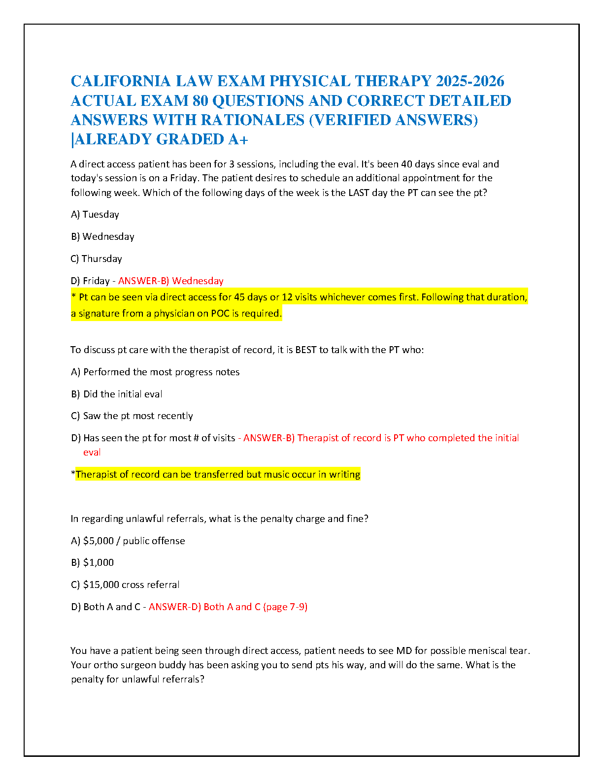 Prepare to pass your California Physical Therapy Law Examination (CLE) on the first try with our comprehensive 2025-2026 test bank. This guide features 80 authentic exam questions, each paired with a verified, correct answer and a detailed rationale to ensure you understand the reasoning behind it. Already graded A+, this resource covers crucial topics like direct access rules, therapist of record responsibilities, and regulations on unlawful referrals. Stop stressing about the CLE and start studying with a tool designed for success. Master the material, build your confidence, and ace your exam with ease!