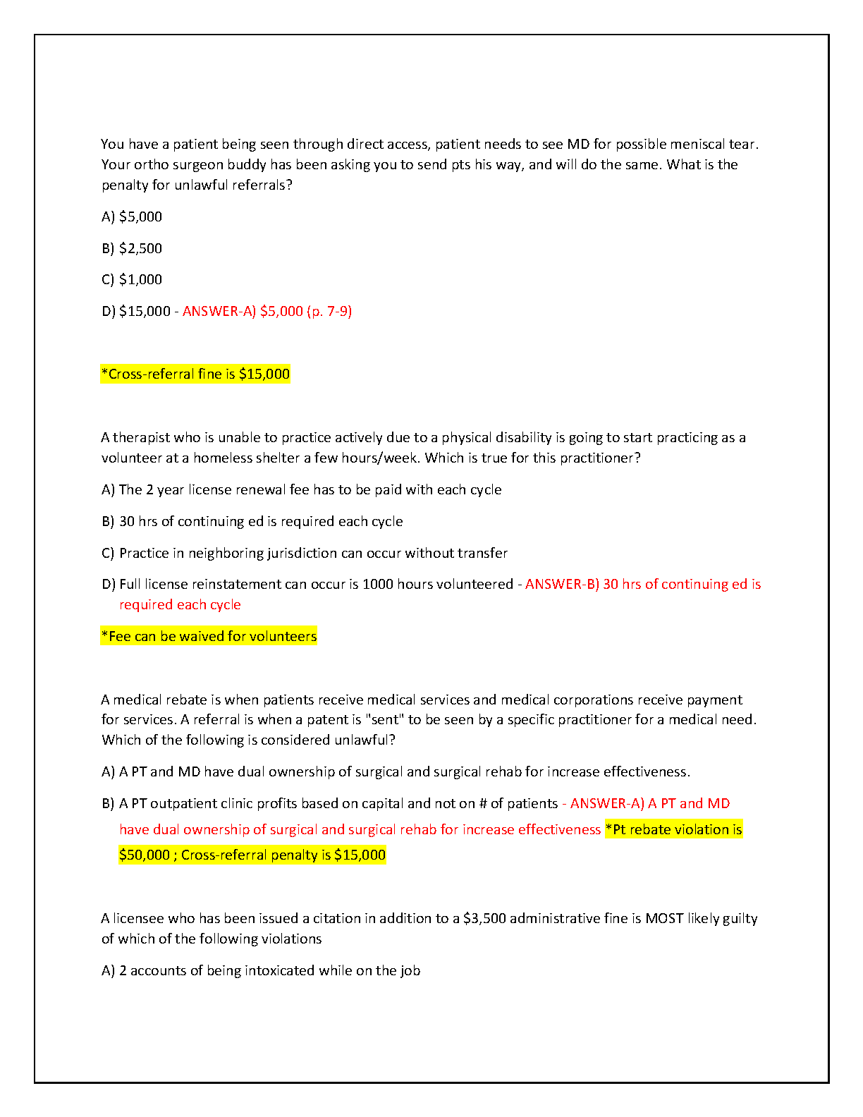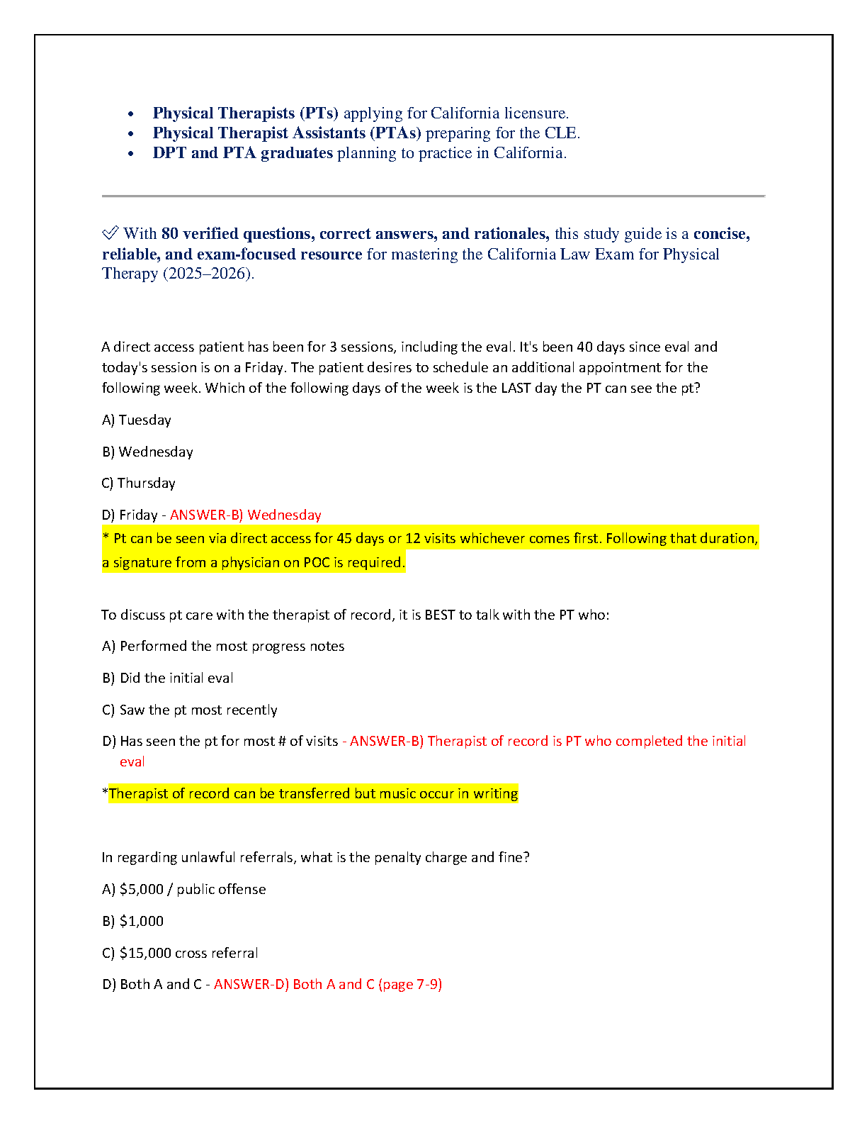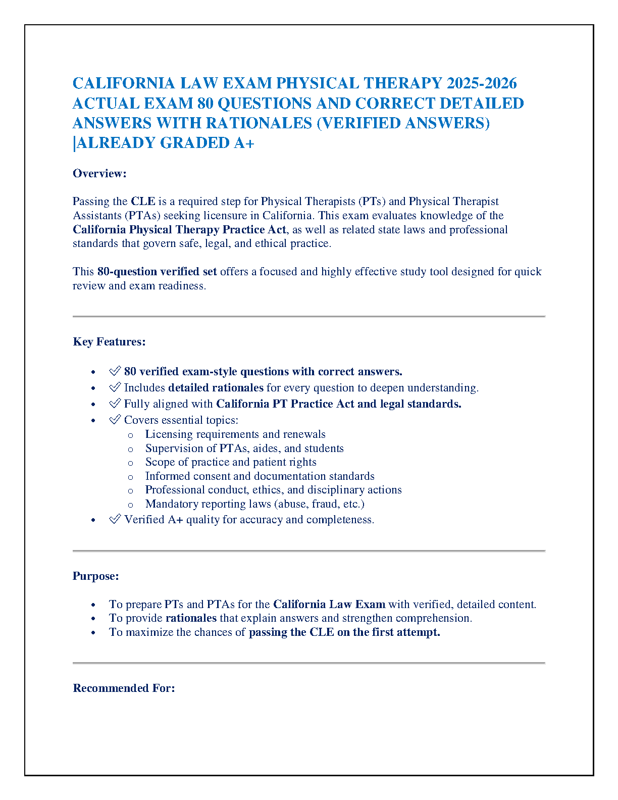 Ace the California Law Exam (CLE) for Physical Therapy on your first attempt with our updated 2025-2026 test bank. This comprehensive study guide is expertly crafted for Physical Therapists (PTs) and Physical Therapist Assistants (PTAs) seeking California licensure. Inside, you'll find an 80-question exam set with verified answers and detailed, easy-to-understand rationales for each question. This resource is fully aligned with the latest California Physical Therapy Practice Act, covering all essential topics such as licensing, scope of practice, professional ethics, and legal standards. Maximize your study efficiency and build the confidence needed to pass without resits. Get the A+ graded material you need for success!