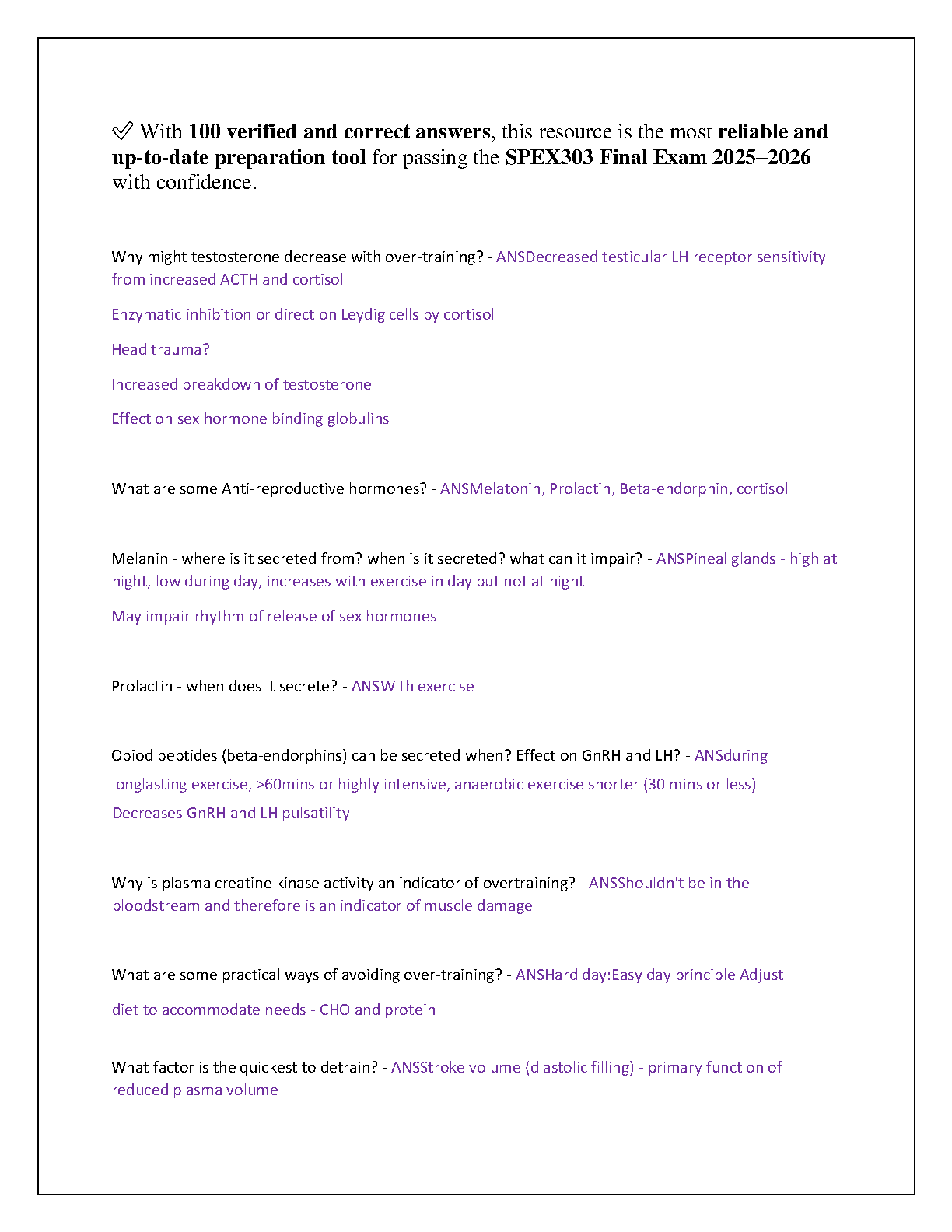 Unlock academic excellence in your SPEX303 Exercise Physiology course with our latest 2025-2026 Final Exam Test Bank. This comprehensive study guide is meticulously designed to help you pass on your first attempt, featuring 100 verified questions complete with accurate, A+ graded answers. Built from actual exam content, this resource provides a thorough review of all key course topics, testing both your theoretical understanding and practical problem-solving skills. Get the edge you need to master the subject matter, boost your confidence, and secure top grades. Perfect for final exam preparation and self-assessment.
